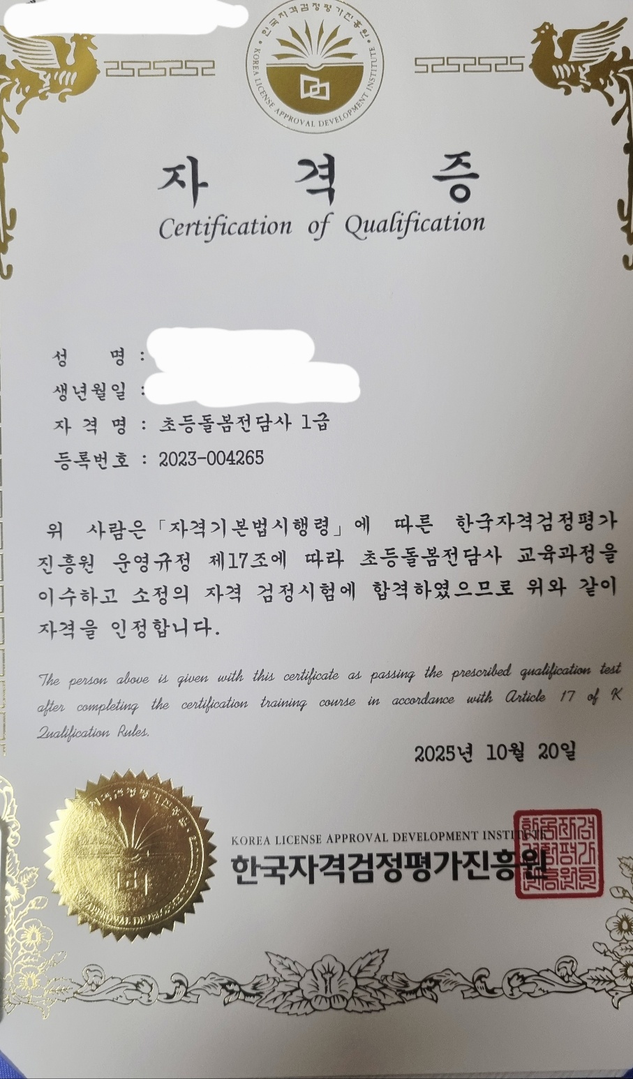 초등돌봄 신청해 보려고 시도하던 중 민간자격증이 있고 인터넷으로 무료강의를 들을 수 있길래 수강신청해서 취득하게 되었어요. 시험이 어렵진 않았지만 능력을 키우기 위해 암기도 다 하고 스스로 열심히 했어요. 여기서 자격증 2개나 따서 마음이 뿌듯해요. 민간자격증이지만 공신력있는 자격증을 만들기 위해 꼭 초등돌봄이나 방과 후 합격해서 자격증에 힘을 불어 넣을께요.