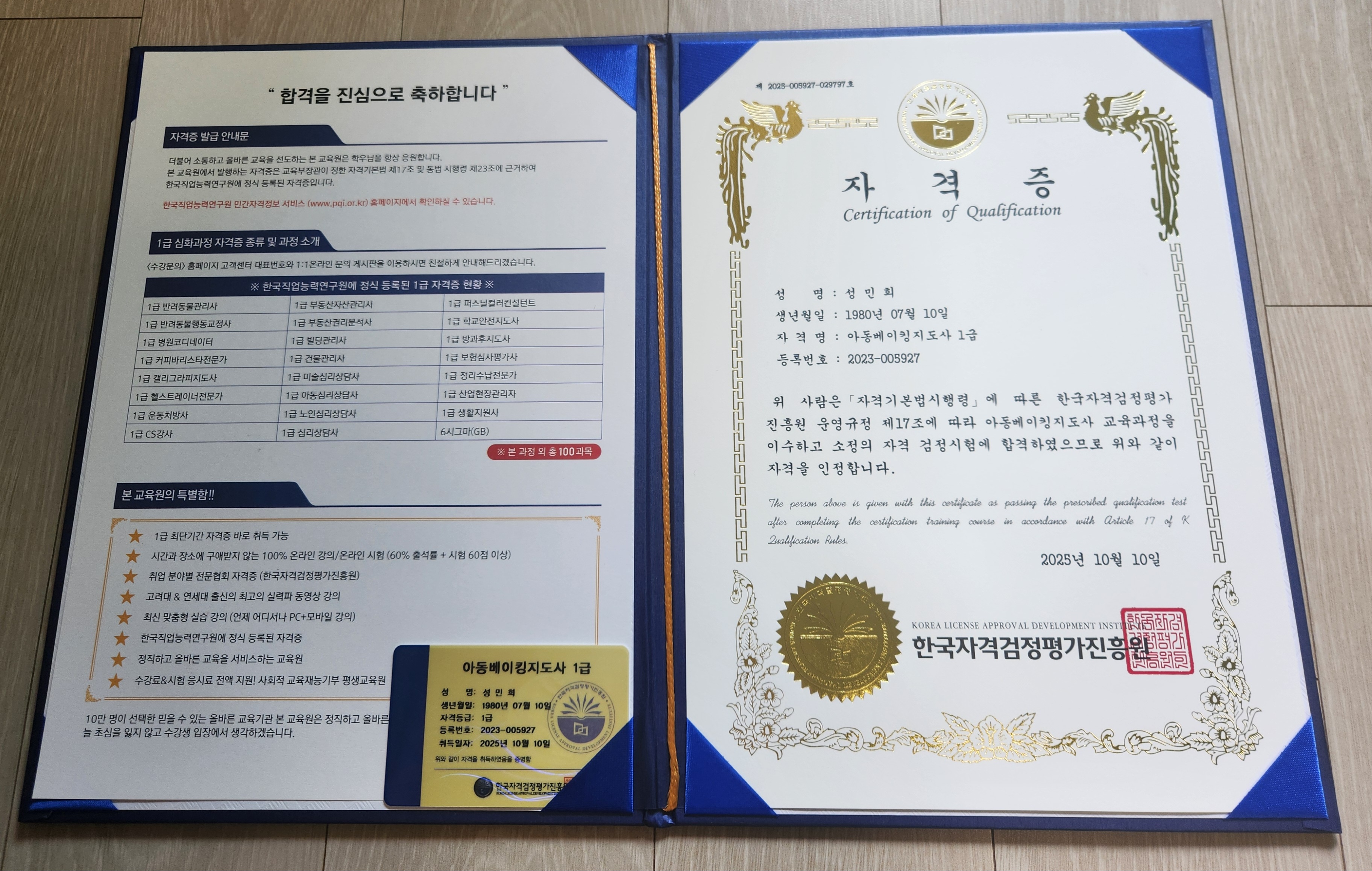 오랜 직장생활을 그만두고 시간적 여유가 되어 자격증 취득 과정중 빠르고 간단한 자격증인증협회의 다양한 과정 참 좋네요. 다른 자격증도 현재 수강중 입니다.