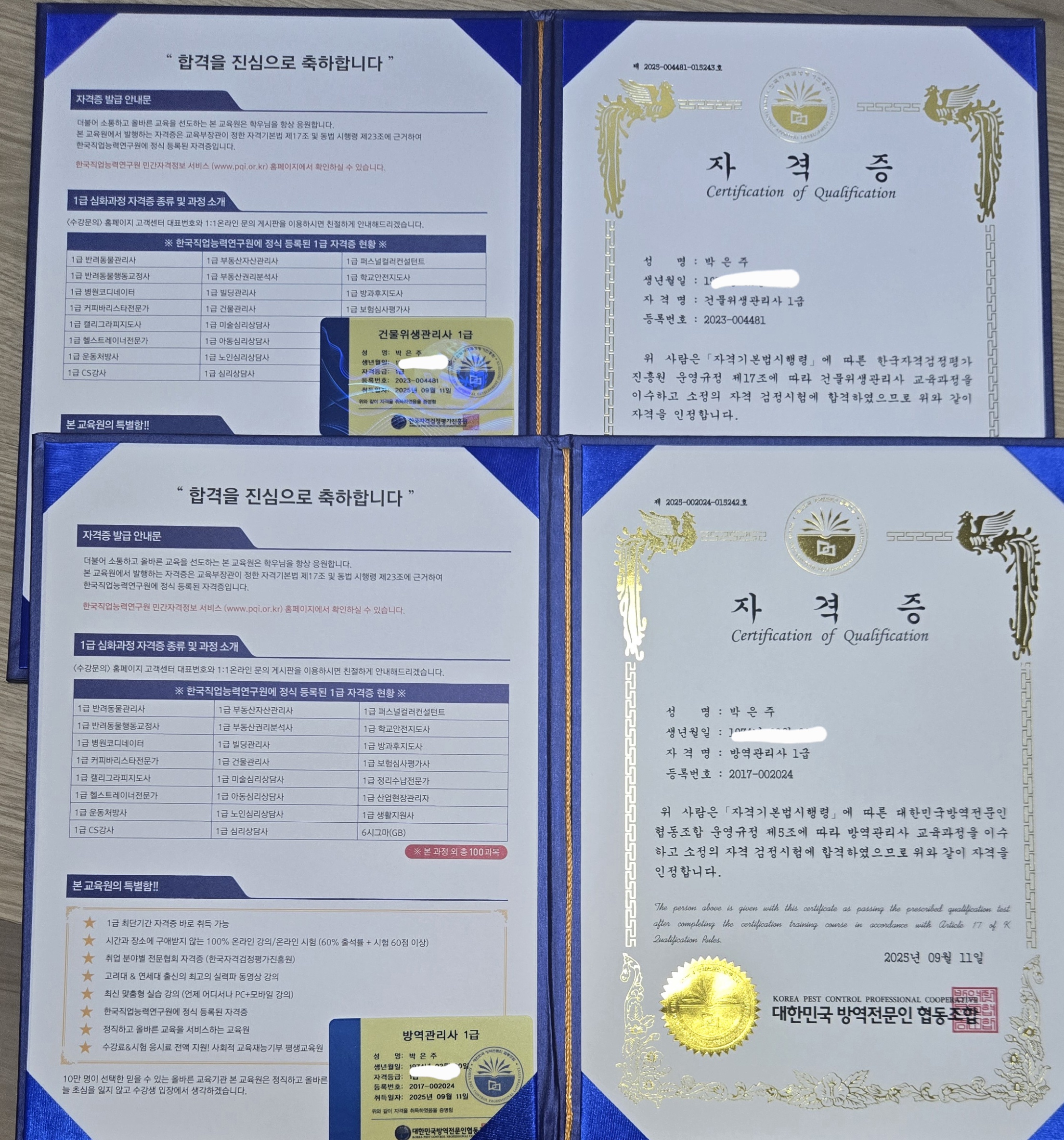 저는 건물청소 일을 합니다. 청소하는데 쓸고 닦기만하지 그외에 아무것도 몰랐습니다.지식적으로 알고 싶어 이 사이트에서 새로운 자격증이 생김에 '이거다' 싶어 2개의 강의를 수강신청을 하게 되었고 합격하여 기쁨니다. 취업하는데 어려움이 없을것 같아요.감사합니다.