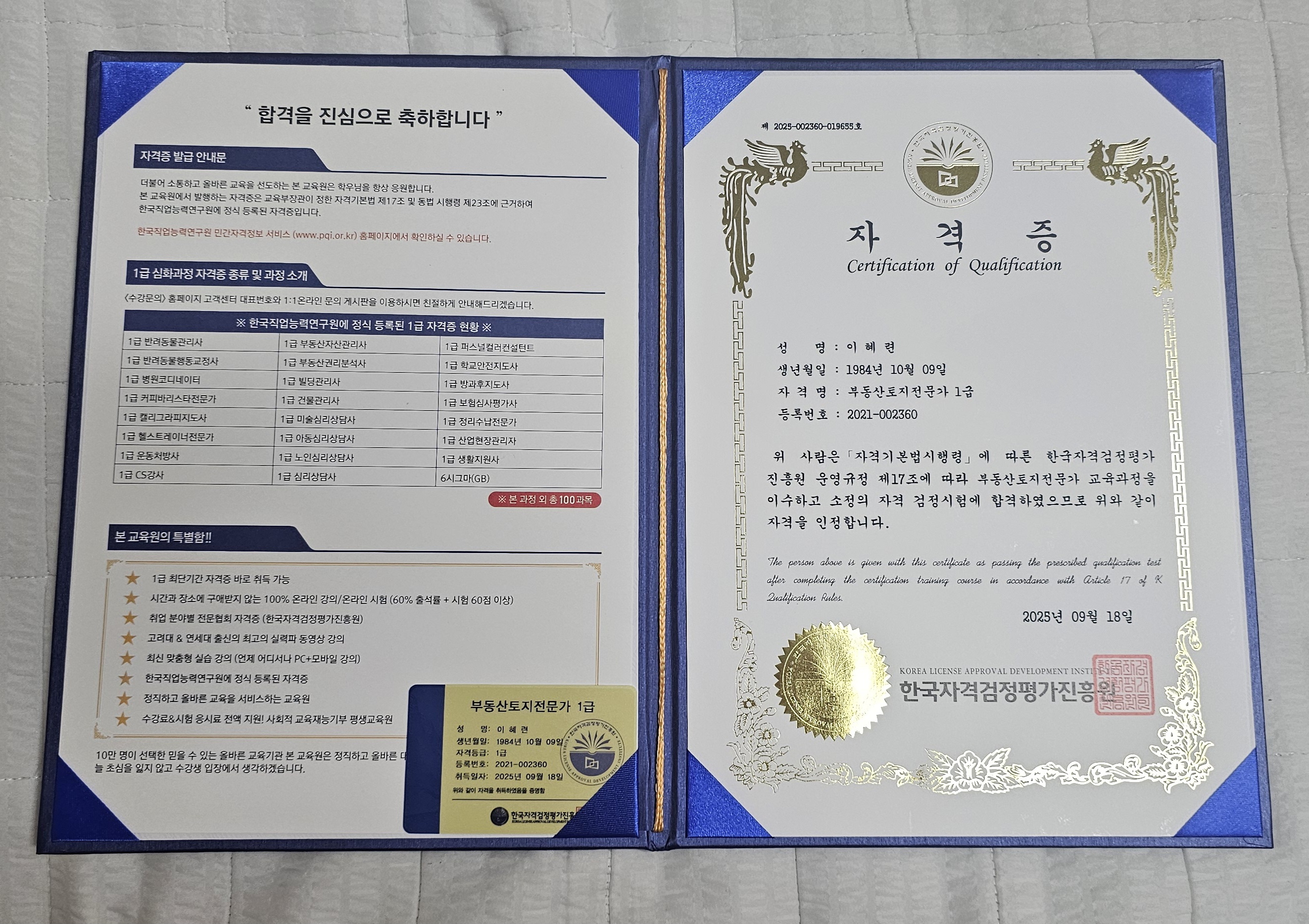 살면서 자격증은 이번이 첨이네요~^^ 강의교수님이 쉽게 잘설명해주셔서 덕분에 토지자격증 합격한것같습니다~ 감사드립니다^^