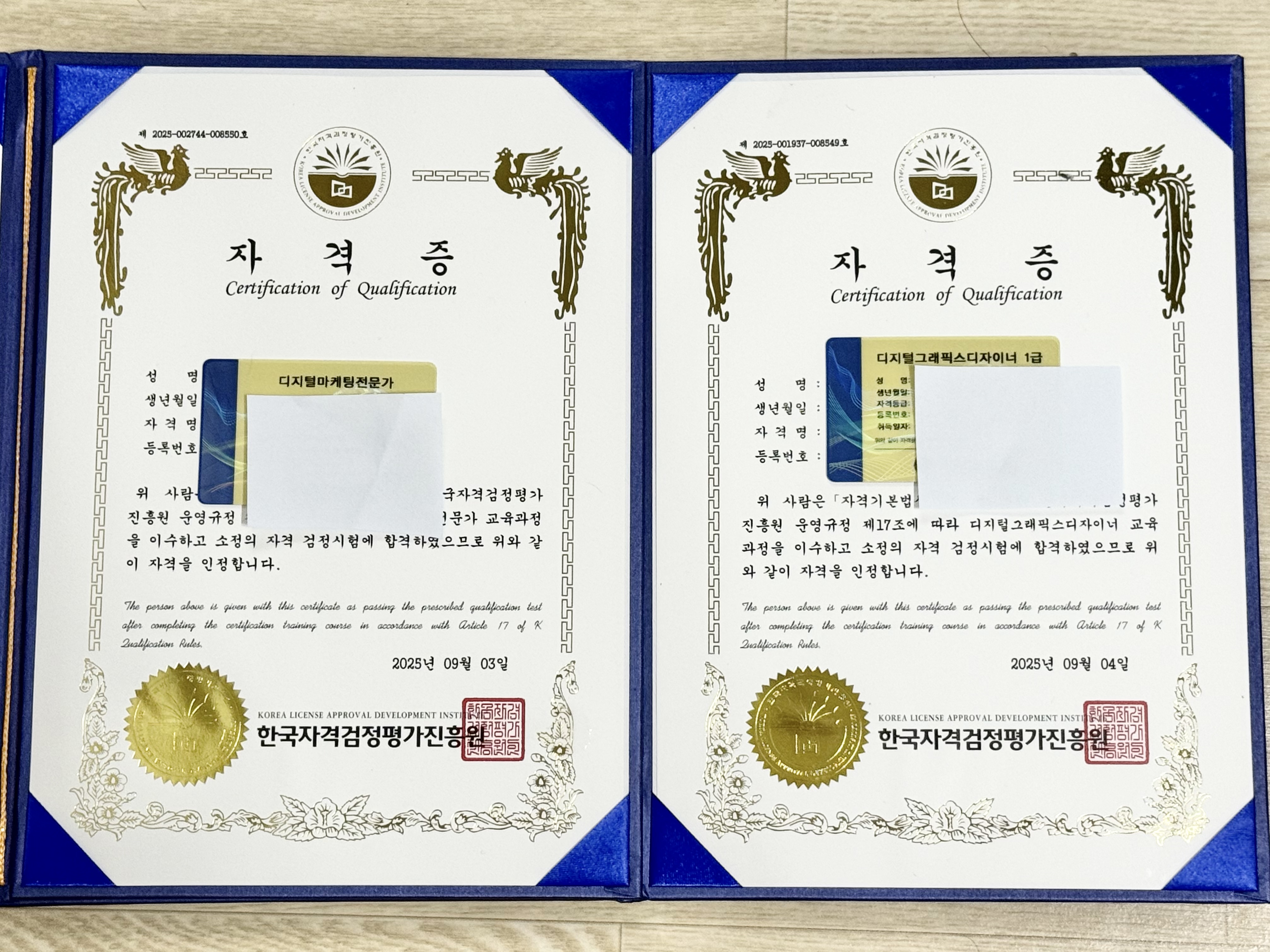 평상시에 학원 다닐 시간이 없었는데... 평상시에 배우고 싶었던 디지털그래픽스와 디지털마케팅전문가 관련 수업들을 무료로 들을 수 있어서 좋았고, 자격증을 받을 수 있어서 좋았습니다.