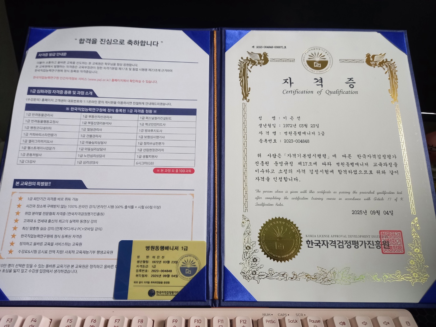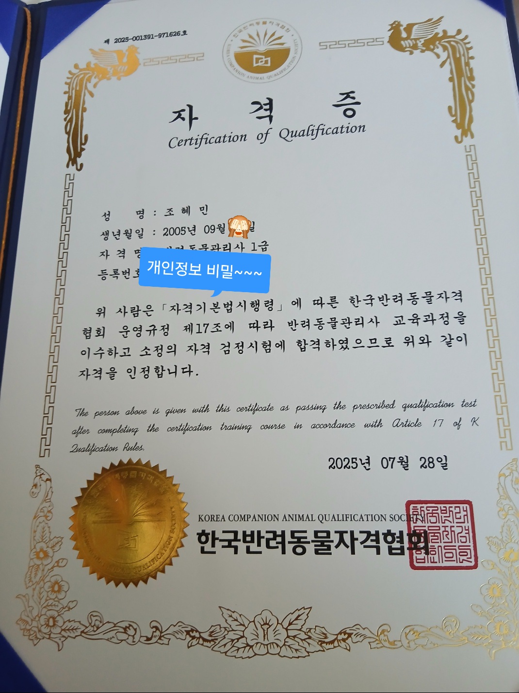 많은 고민과 갈등으로 시작하였으니 자격증 획득으로 자신감 극복하였습니다. 오랜만에 공부도하고 테스트도 하고 설렘과 긴장감 좋았어요. 다른과목도 도전해보고 싶어요