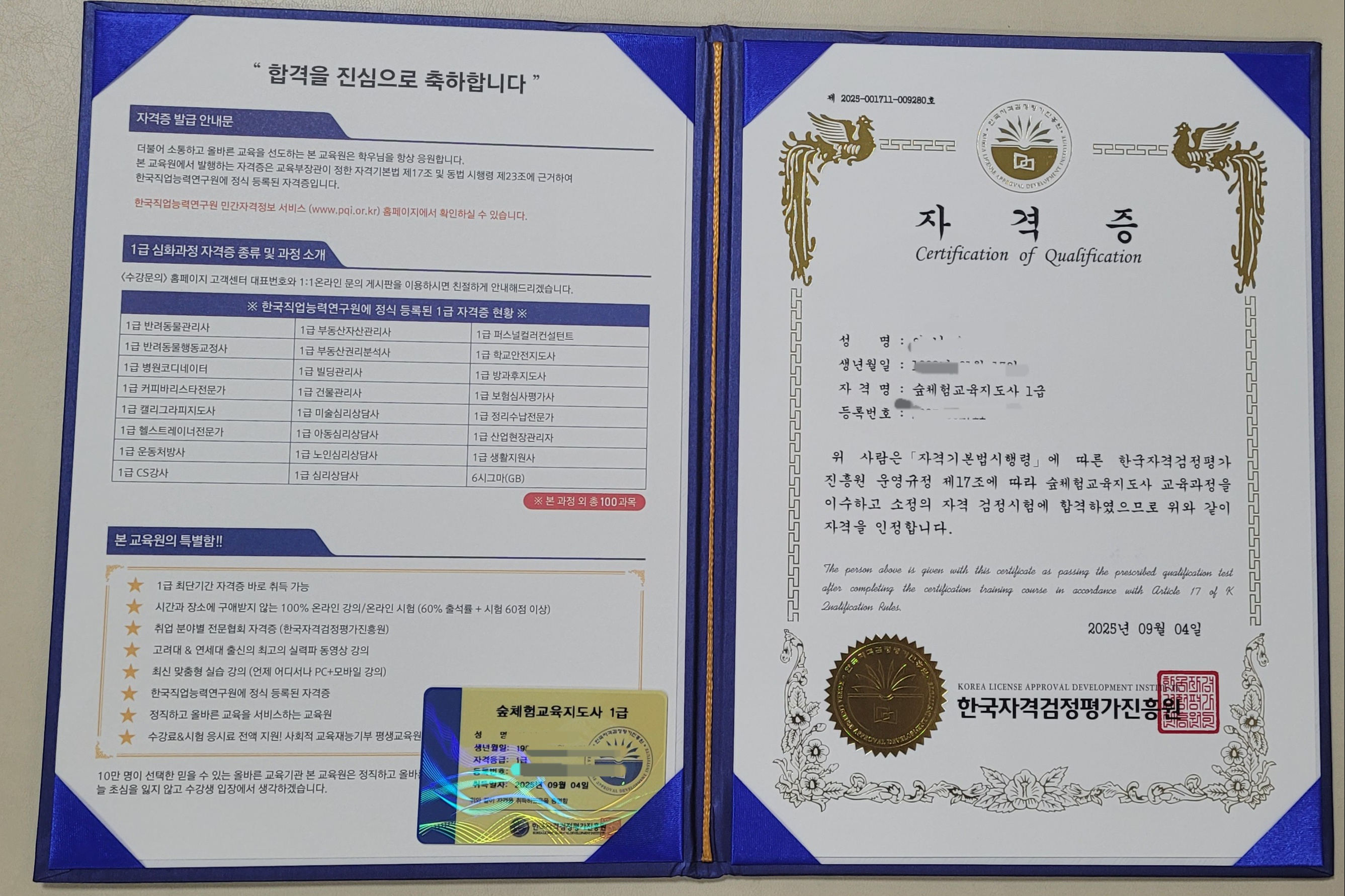 퇴직 후 뭘 할까 생각 중에 제일 관심이 가는 자격증이 숲체험교육지도사 1급이었다. 강의를 들을수록 내가 하고싶은 일이라는 확신이 들었다. 아이들과 숲체험의 여러활동을 한다생각하니 정말 재미있고 행복했으며 앞으로가 기대된다. 나를 성장시키고 행복하게 하는 동력이 될 것 같다.