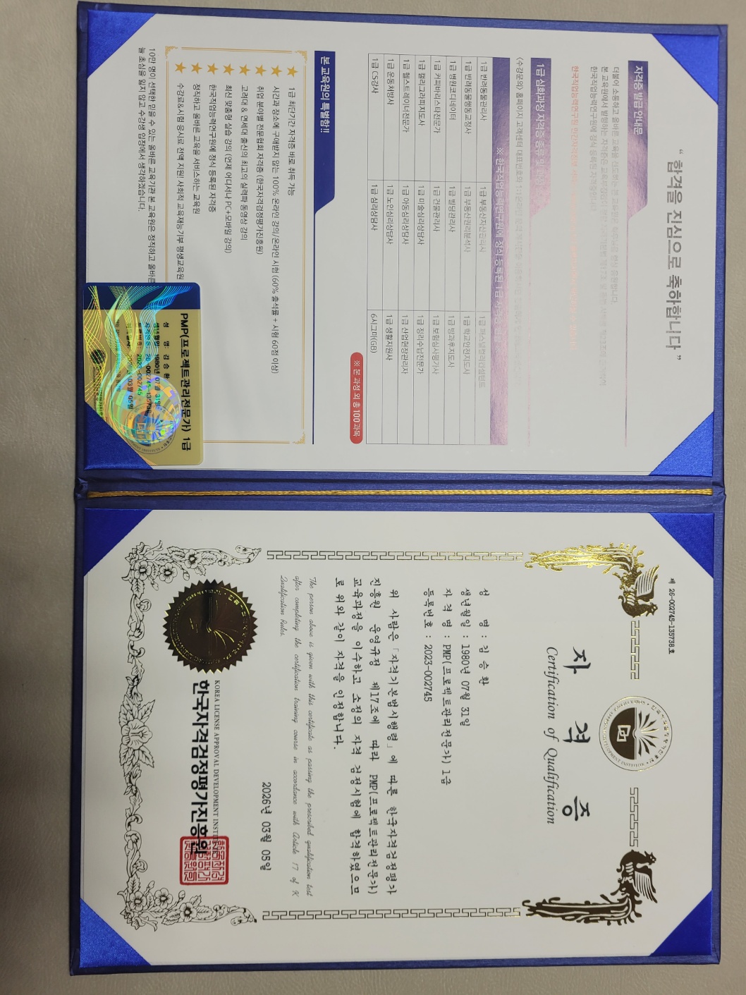 PMP(프로젝트관리전문가) 1급 자격증에 합격했습니다. 시험 준비를 통해 프로젝트 관리의 원칙과 체계를 다시 한번 정리할 수 있는 의미 있는 시간이었습니다. 앞으로도 실무에 적용하며 더 성장하는 PM이 되겠습니다.
