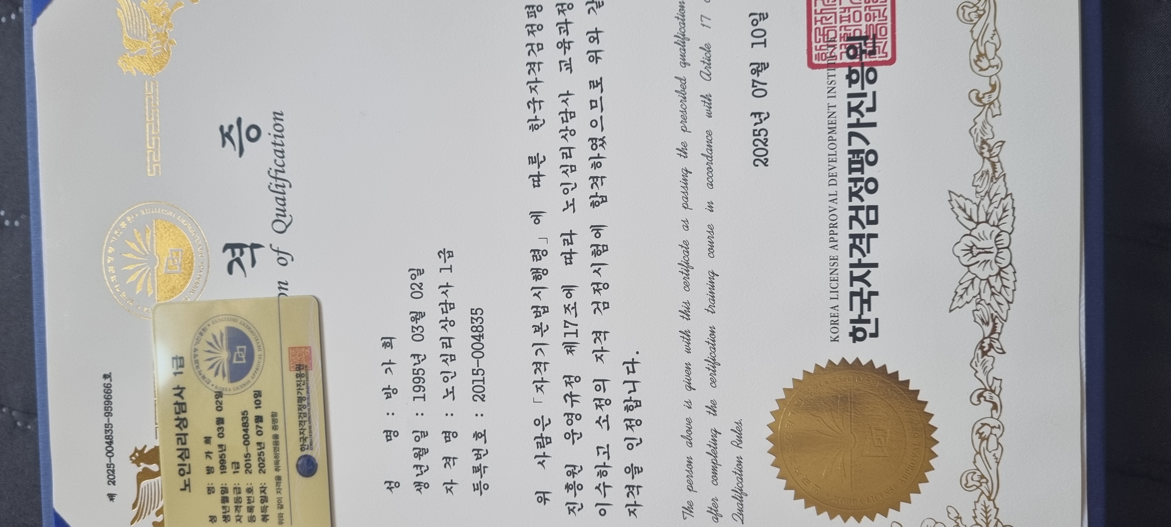 노인심리상담사1급취득했는데 고급스러운 상장으로 바로 주시네요^^