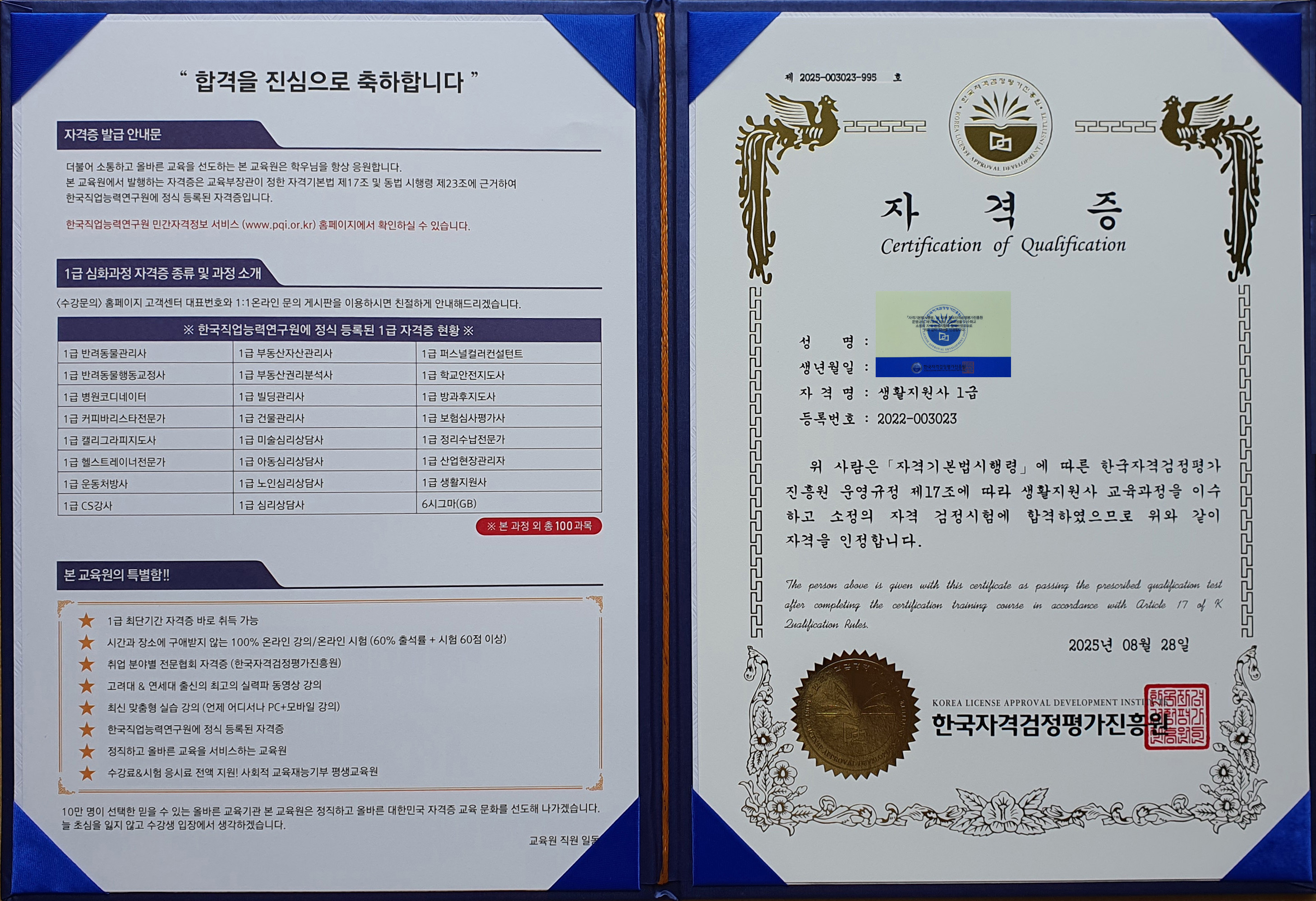 장애인활동지원사지도사1급 아들이랑 같이 취득했어요. 장애인활동지원사 과정은 대기가 많은데 지도사 1급은 온라인과정이라 수강신청을 하였습니다. 기출문제도 공유해주시니까 어려움없이 취득할수 있었네요.강의들으면서 공부가 많이 되었습니다.유용하게 쓰일수 있길 기대해 봅니다.