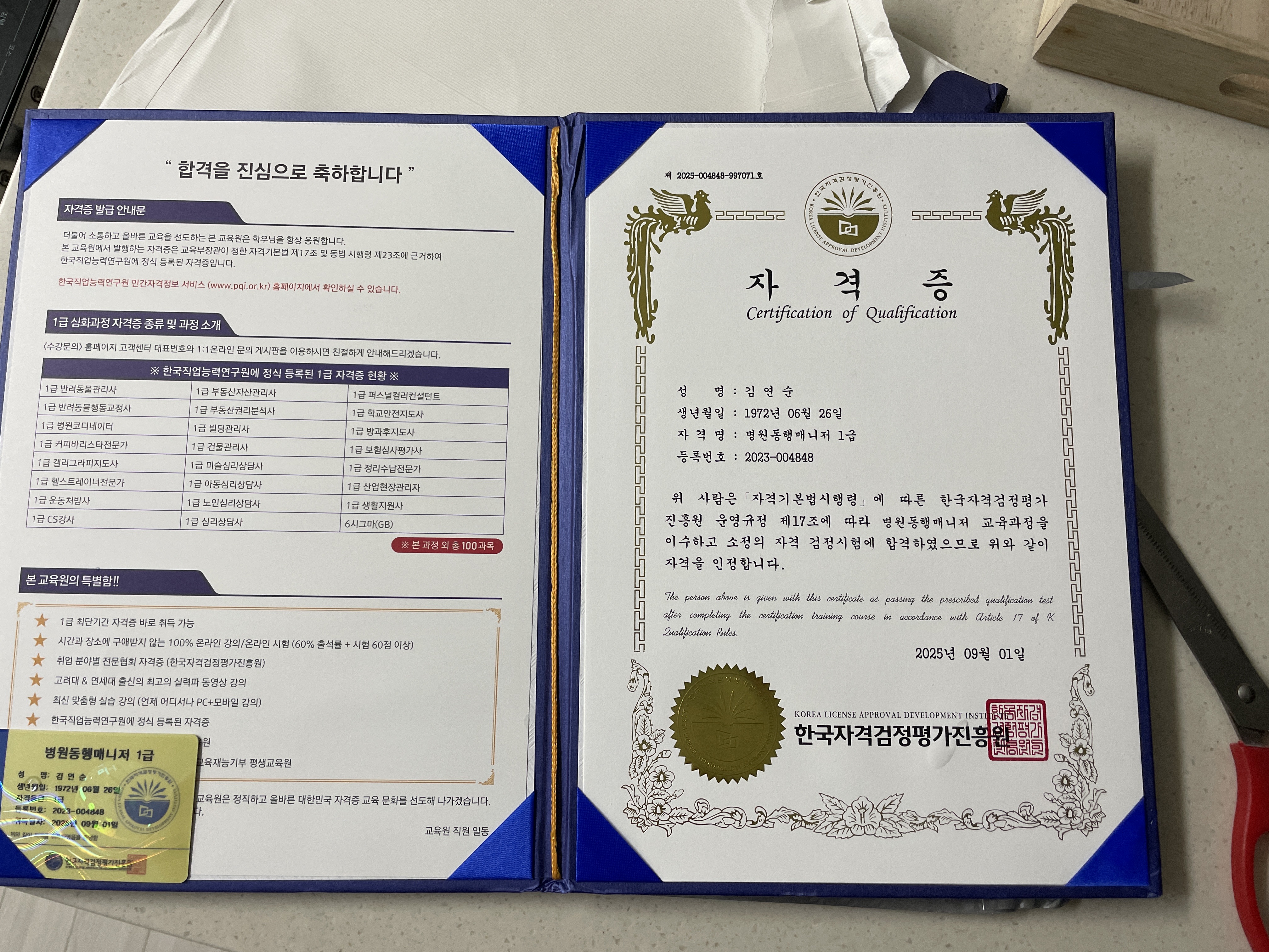 우연한 기회에 병원동행매니저를 접하고 바로 자격증 취득할 수 있는 곳을 찾아봤어요. 합격후기도 많고 검증된 협회라 더 믿음이 갔어요. 자격증을 받고 나니 뿌듯하네요~