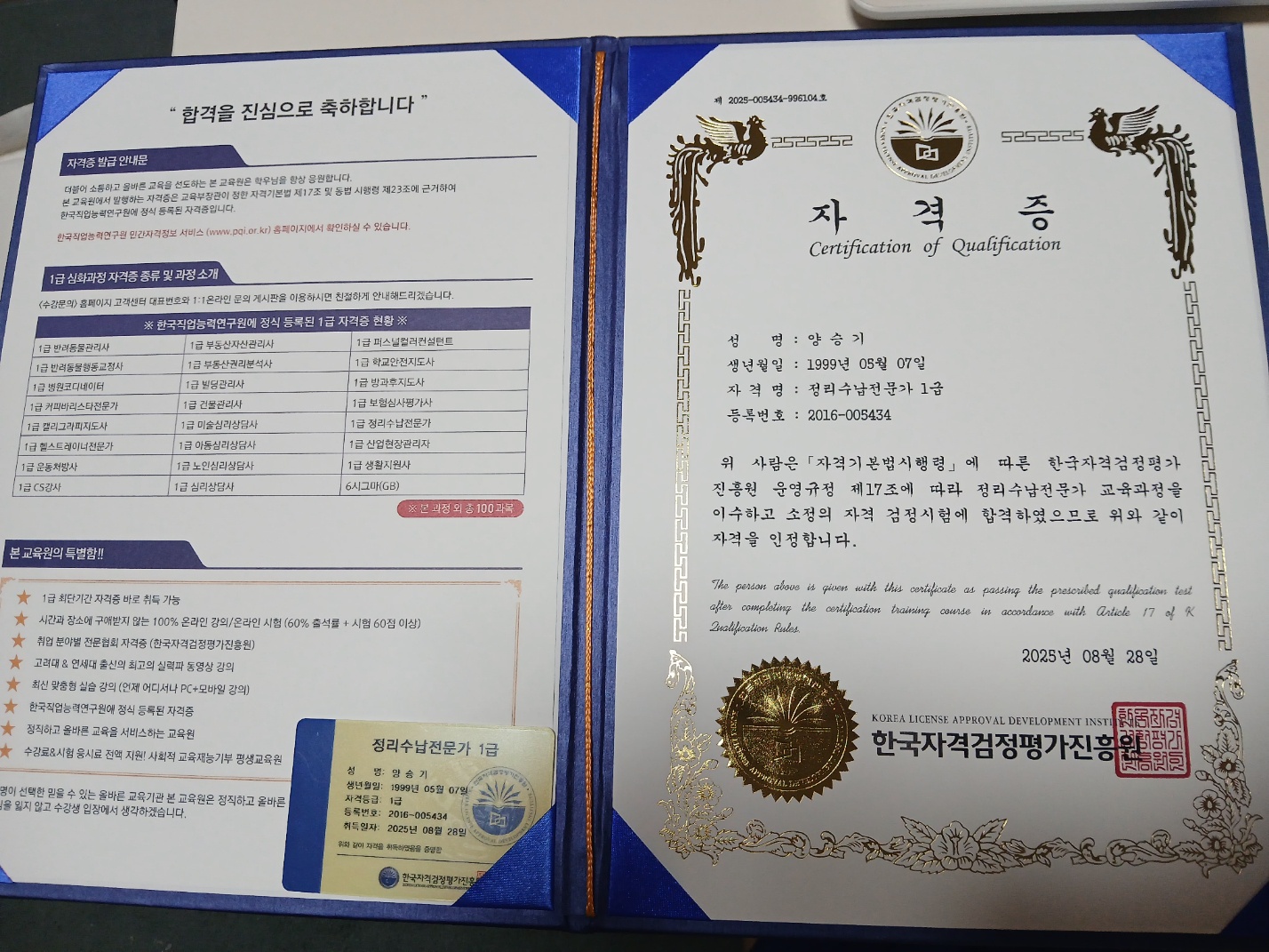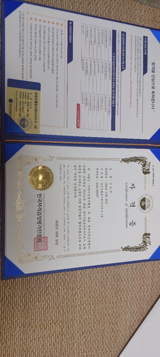 늦은나이에 정말 의미있는 자격증을 받았습니다 제 처음의 시작인대 앞으로 더 많이 얻어보싶어서 꾸준히 공부할의지를 주셔서 감사합니다