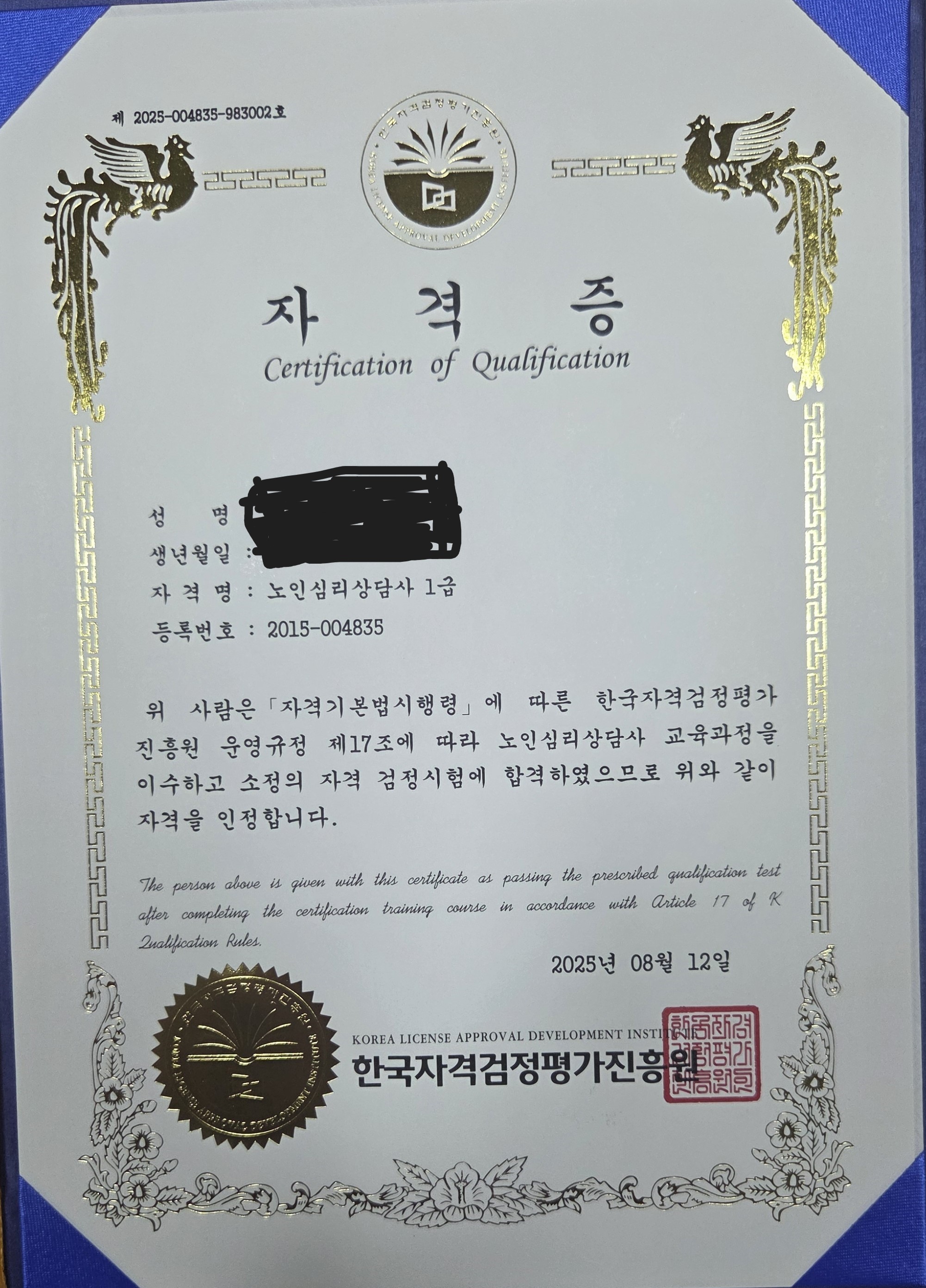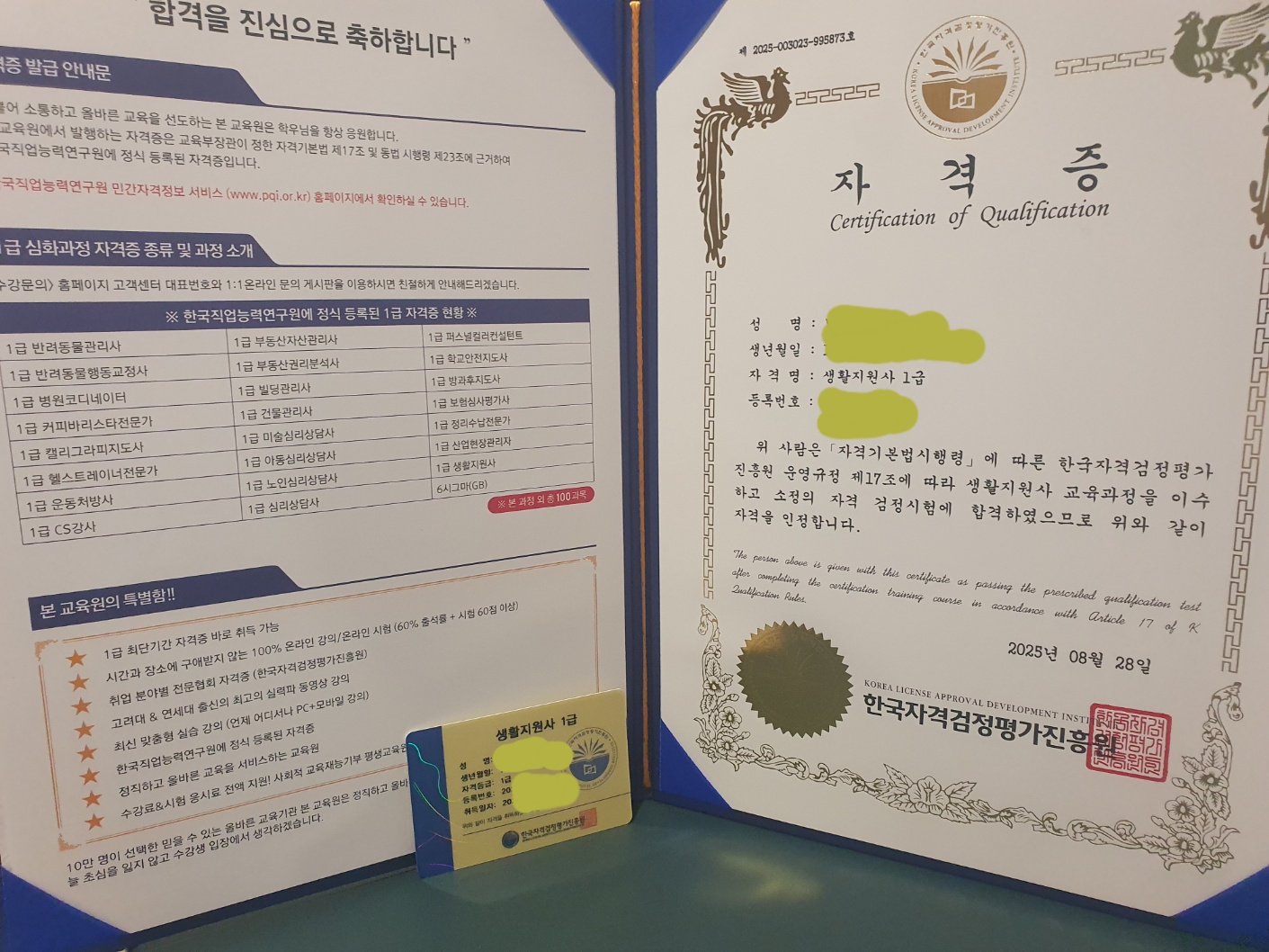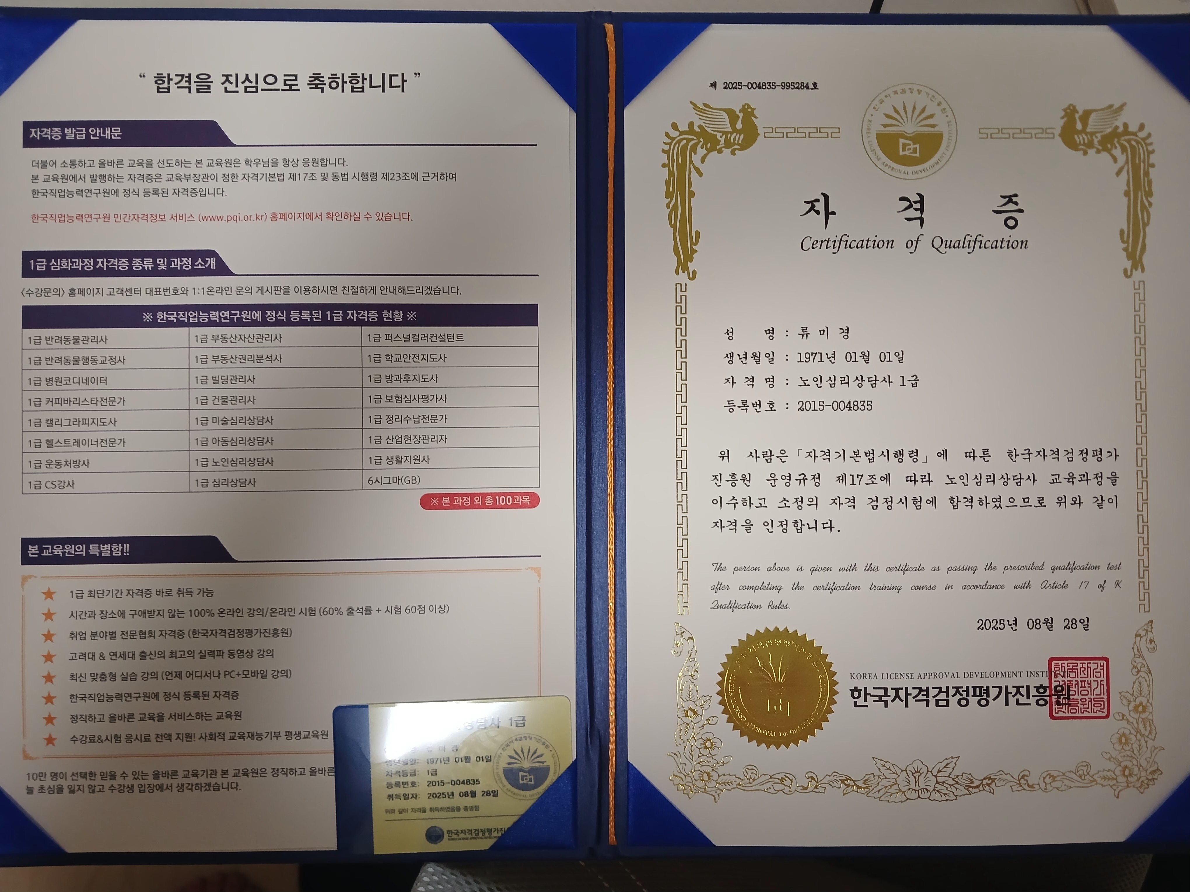 딸의 권유로 봤는데 하길 잘 한것 같아요 나이가 점점 늘여가니 자존감이 떨어지고 의욕 없었는데 자격증 하나로 기분이 업되고 할수있다는 자신감도 생겨나네요 감사합니다