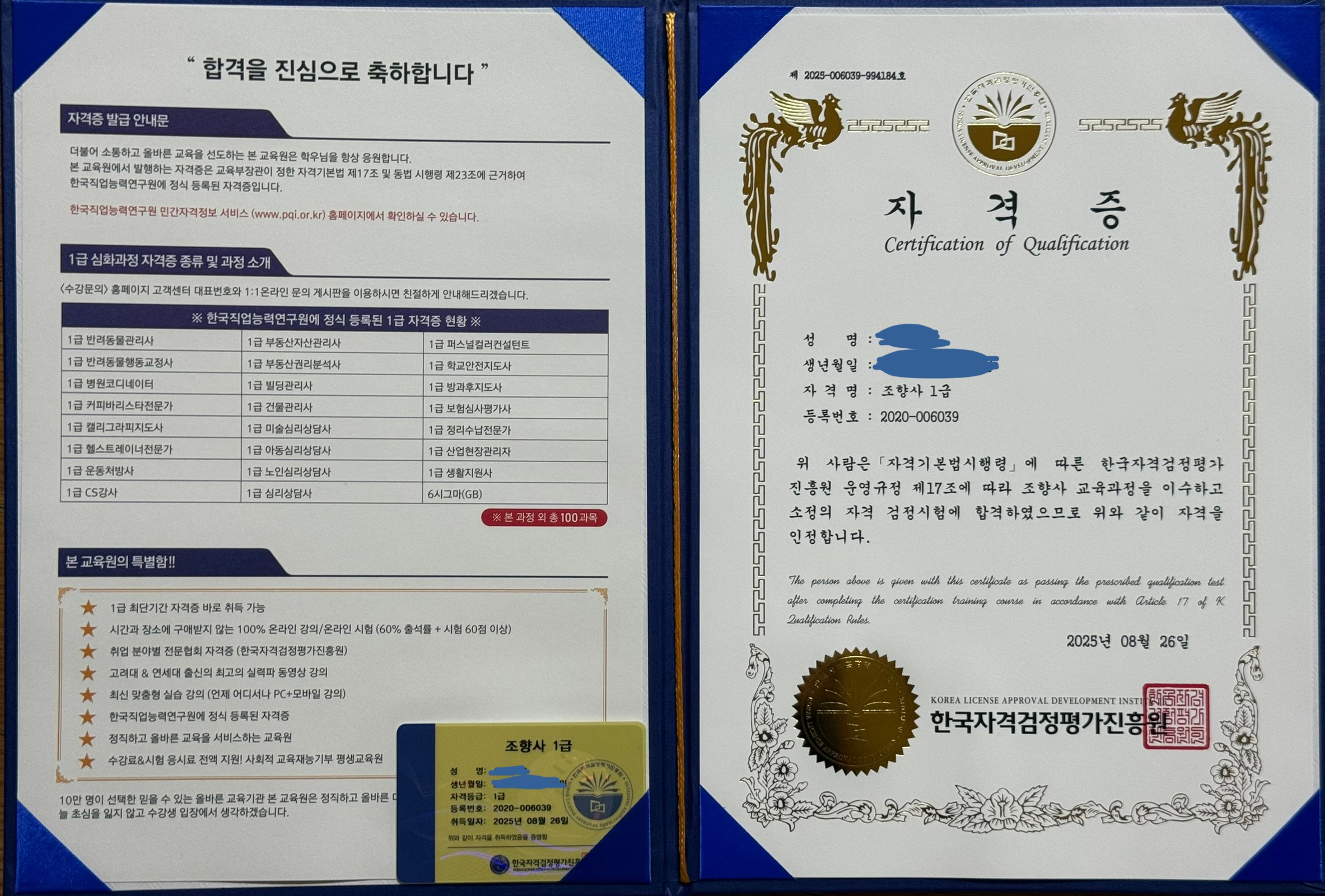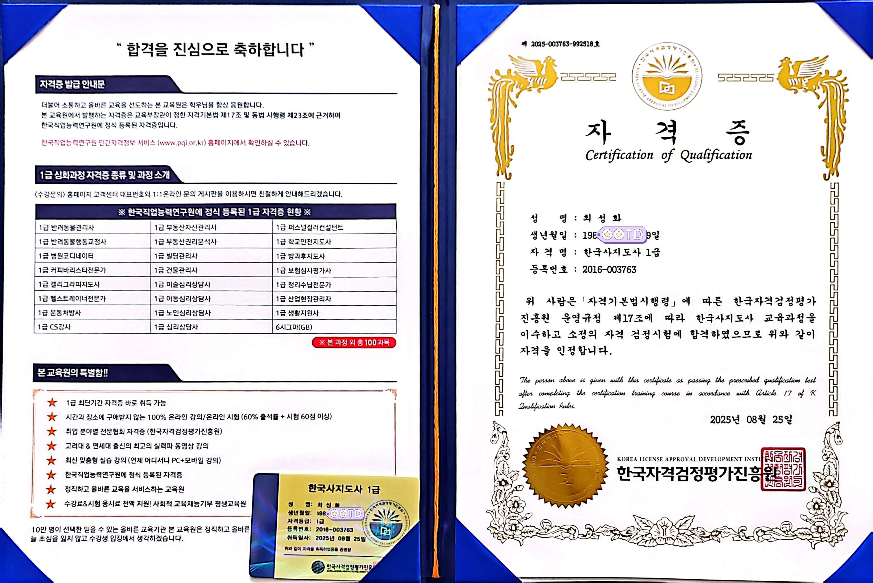 한국사능력시험2급도 있지만 이렇게 지도사 1급을 취득하니 더 든든하고, 일하는데 더 도움이 될 것 같습니다. 수업도 재미있게 해주셔서 좋았고, 다시 공부하는데 길잡이가 될 것 같아요^^