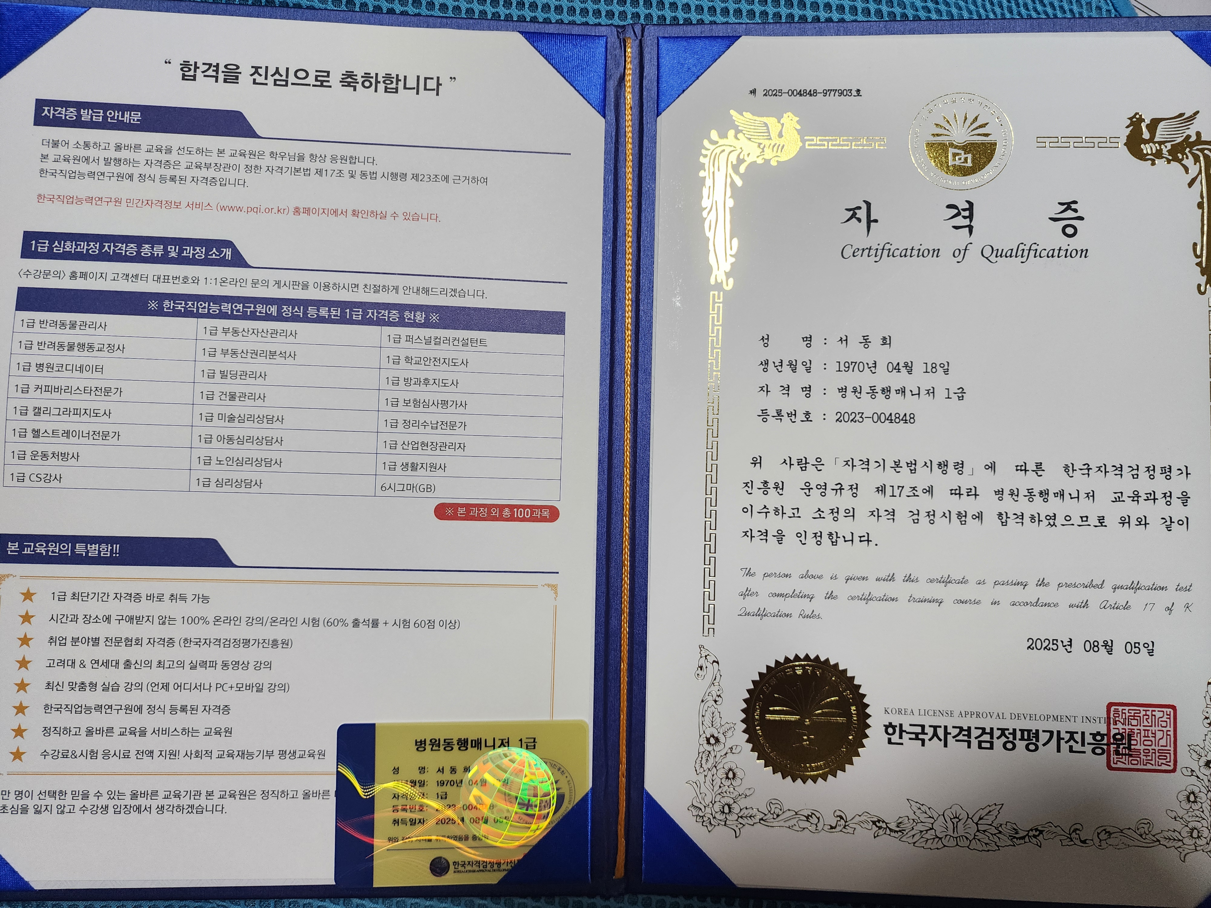 퇴직을 앞두고 퇴직후 앞으로 할일을 찾아보다 국민 교육 복지센터 를 알게되어 자격증 공부를 하게 되어 자격증 을 취득하게 되었습니다 퇴직후 많은 도움이 되리라 생각 합니다 교육 잘받았습니다 감사합니다
