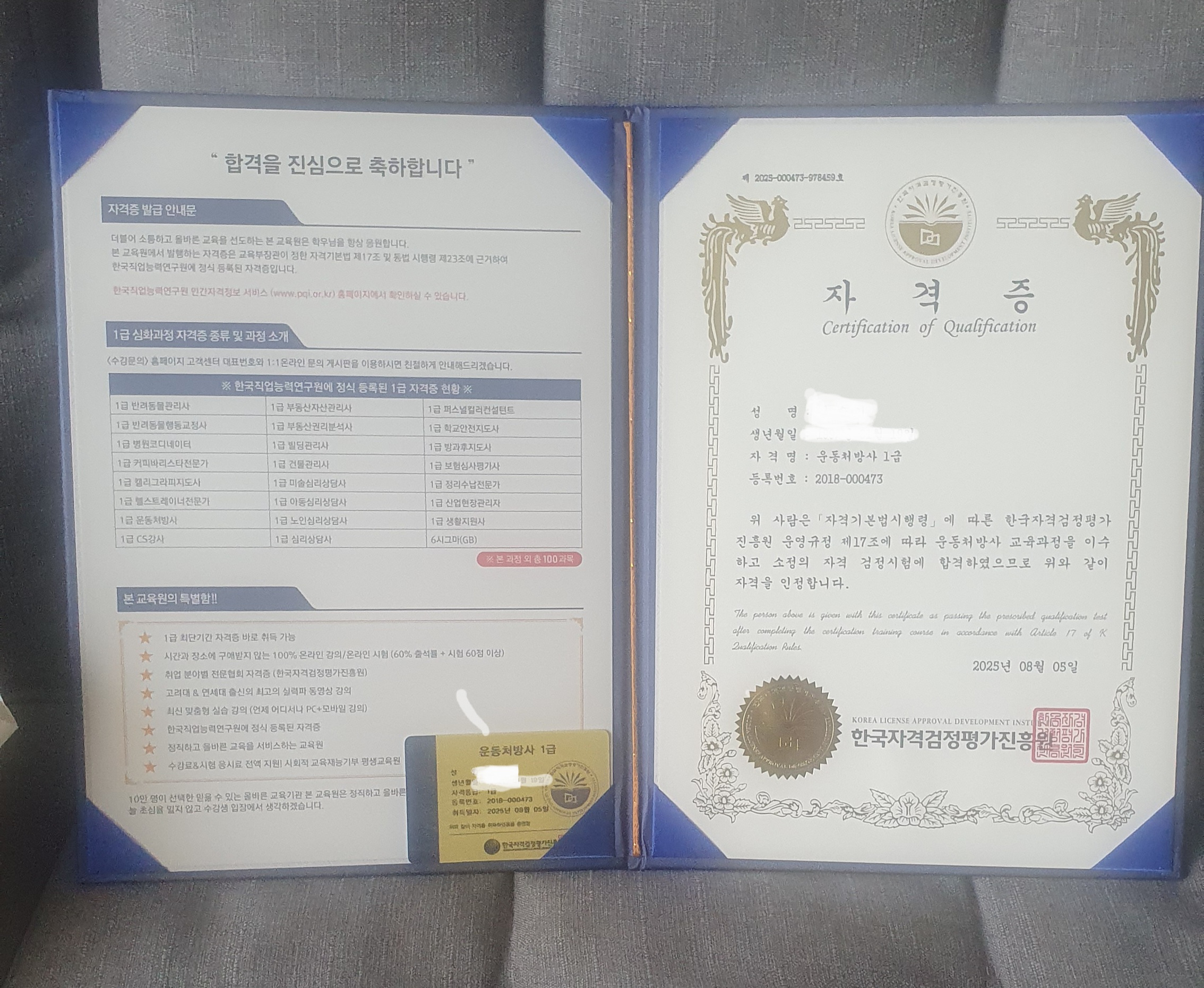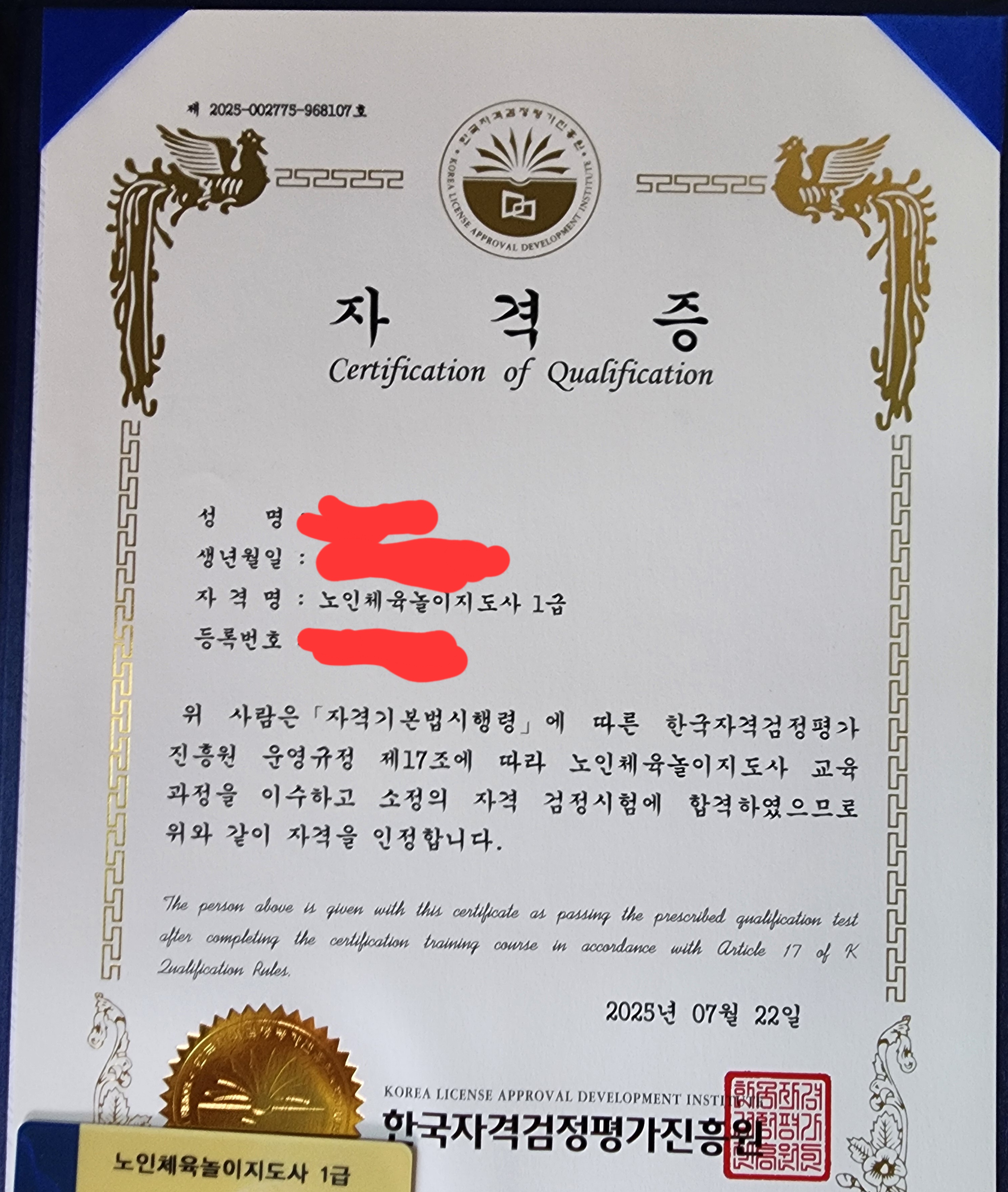 나중에 혹시나 이 자격증이 나에게 도움이 될 수 있지 않을까 해서 노인체육놀이지도사 1급 땄습니다. 열심히 해서 일주일 만에 땄는데 해보니까 저는 재밌더라구요, 자격증 잘 받았습니다.