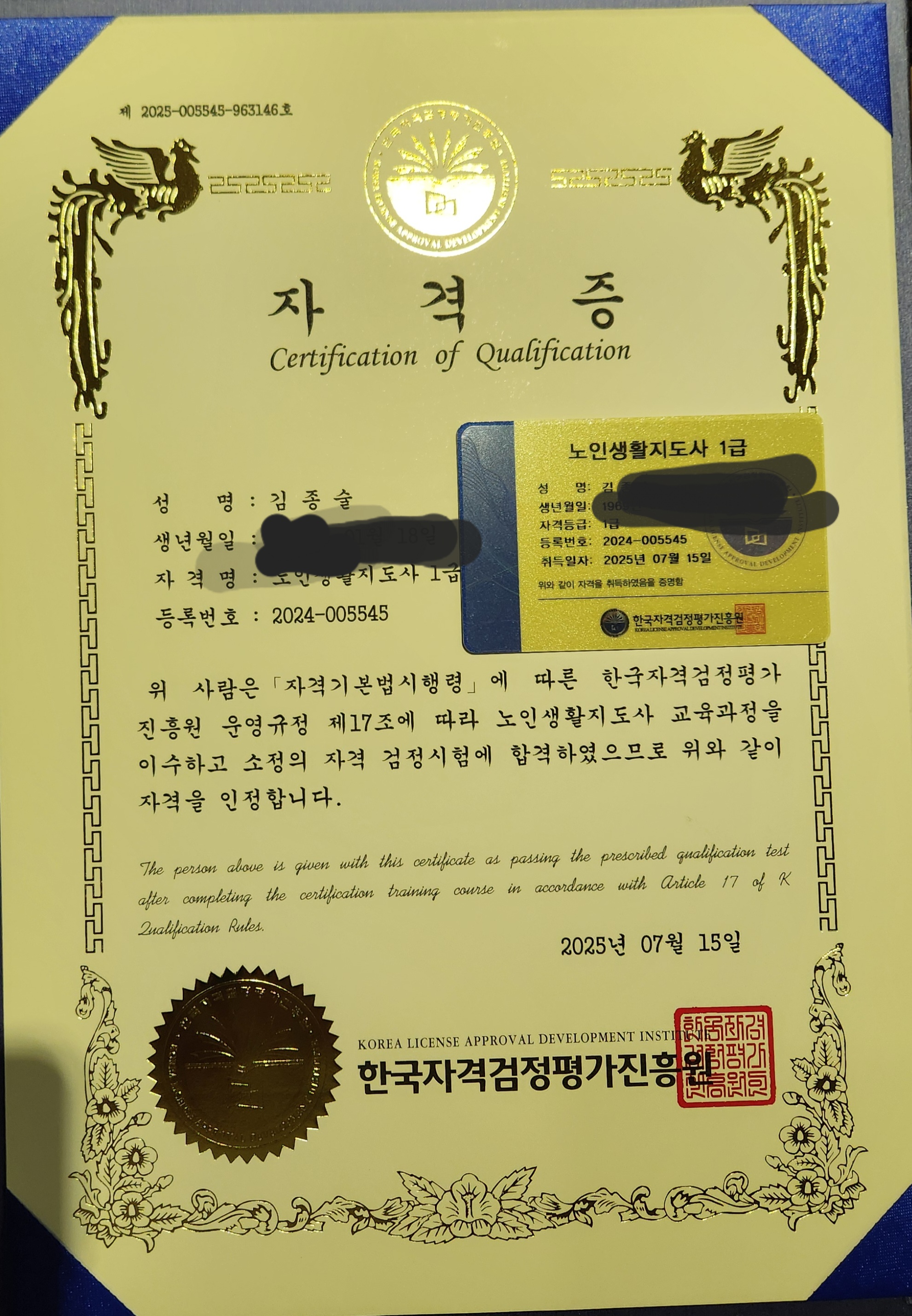 합격했네요 생활 지원사 자격증