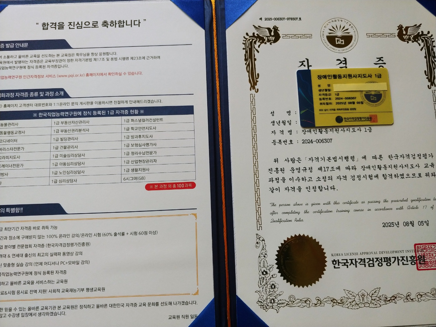 평소 장애인 활동지원에 관심이 많았는데 어디서 자격증을 취득할지 고만히다가 국민복지교육센터에서 일주일 만에 취득하였어요. 잘 활용하고 싶어요.