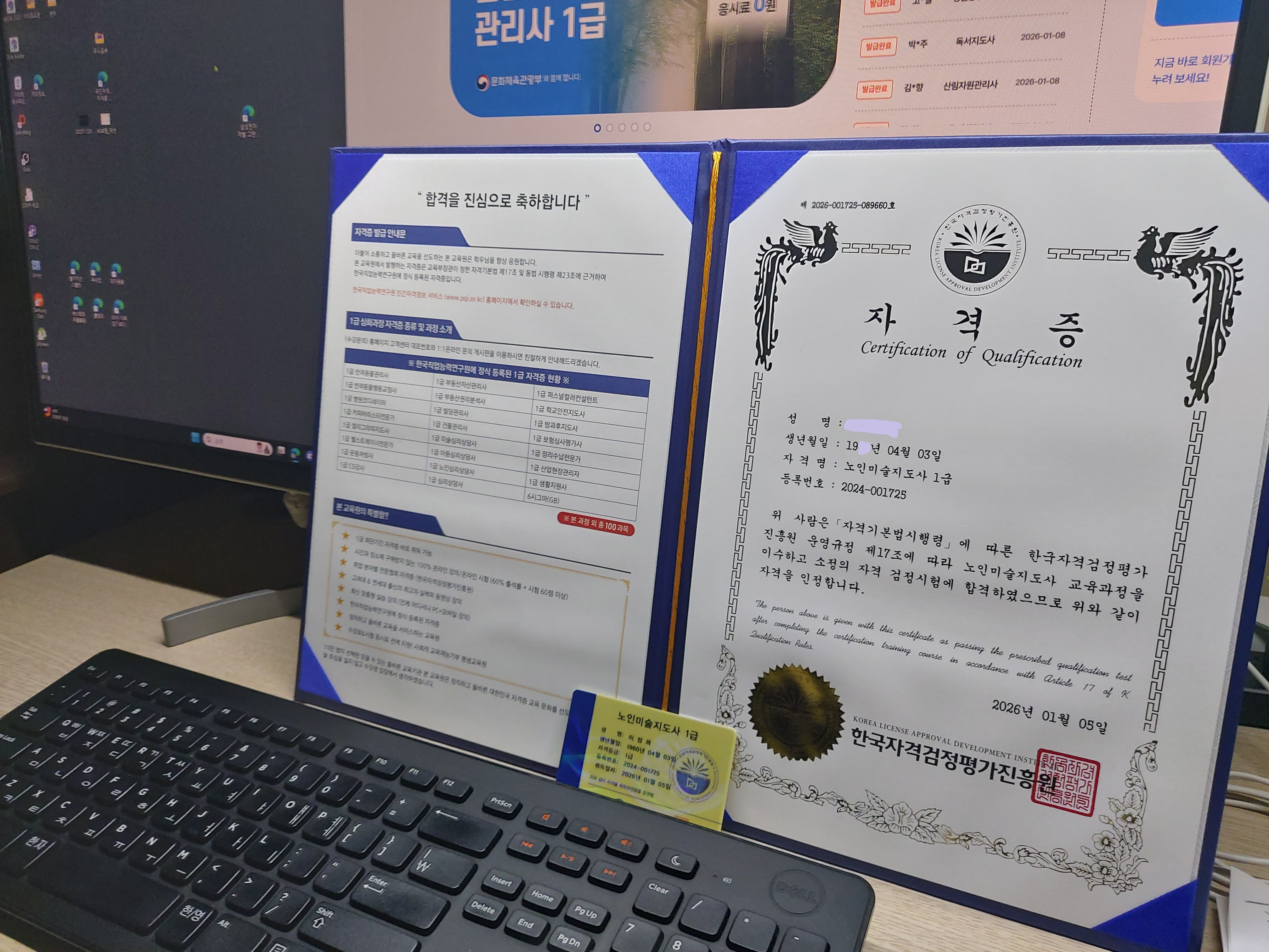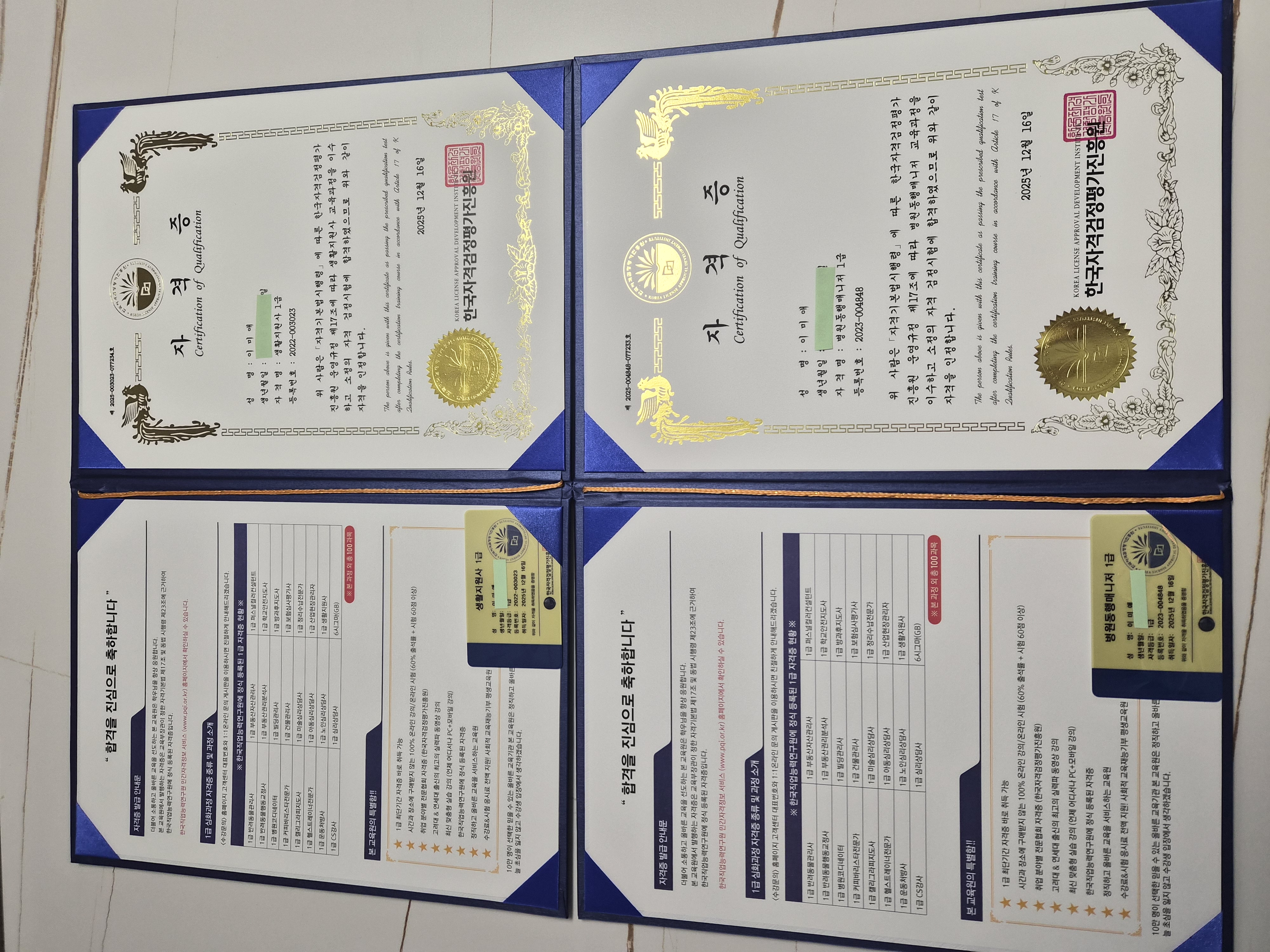 생활지원사 자격증 취득했어요~~ 자유롭게 인강을 들을수 있었고 여유시간 되는 시간에 시험을 볼 수 있어 좋았습니다. 자격증 취득해서 좋아요