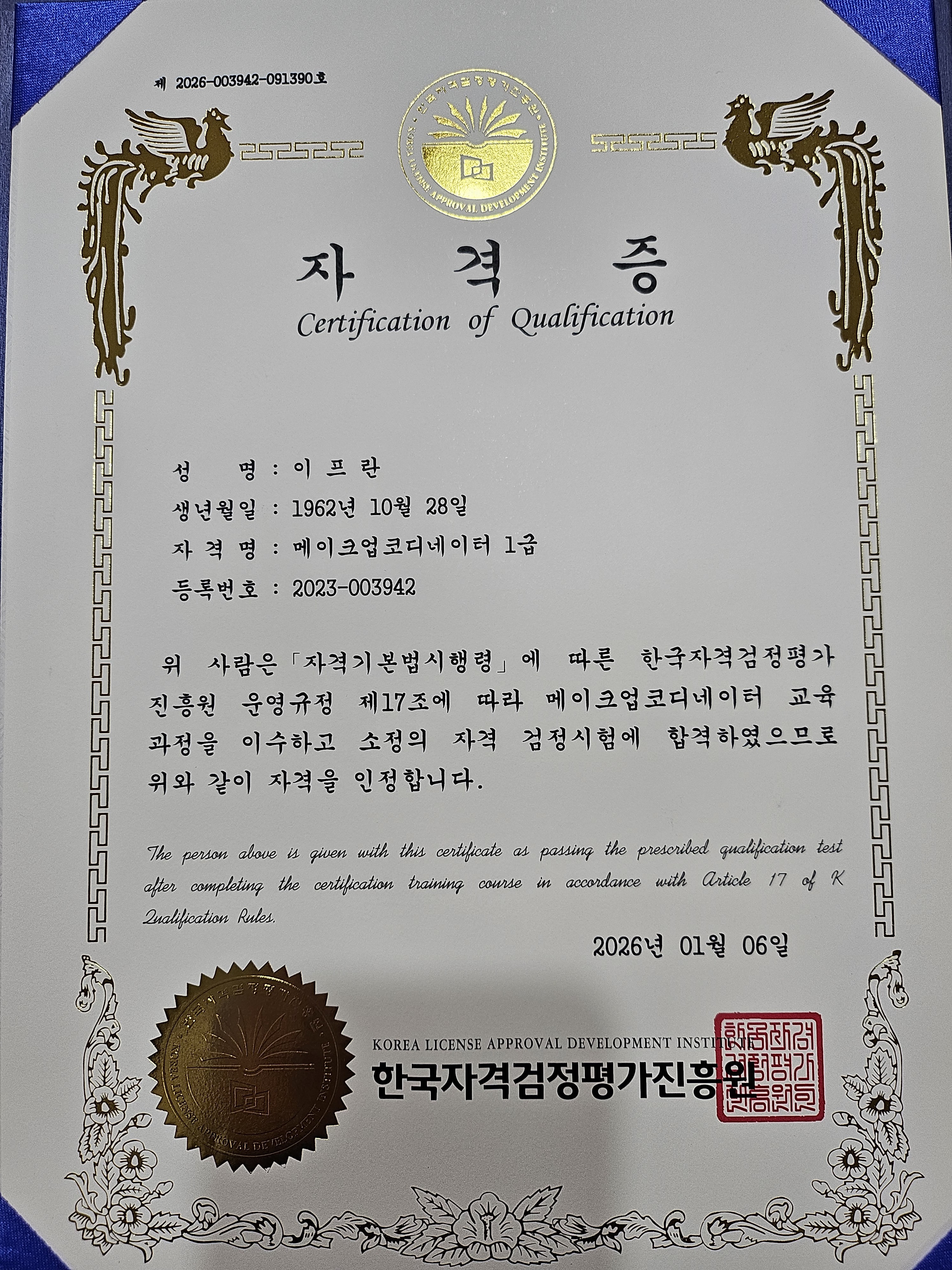 메이크업을 배우고 나서야 그동안 제가 제대로 알지 못한 채 화장을 해왔다는 걸 알게 되었습니다. 체계적으로 배우며 얼굴에 맞는 표현법을 익히자 요즘은 “메이크업 받았어요?”라는 말을 들을 만큼 변화가 생겼고, 자신감도 함께 커졌습니다. 부족함을 느껴 국민자격인증협회 과정을 수강했고 자격증 1급을 취득하게 되어 매우 기쁩니다. 현재는 다른 과정도 수강 중이며, 계속해서 배우고 성장하고 싶습니다. 감사합니다.