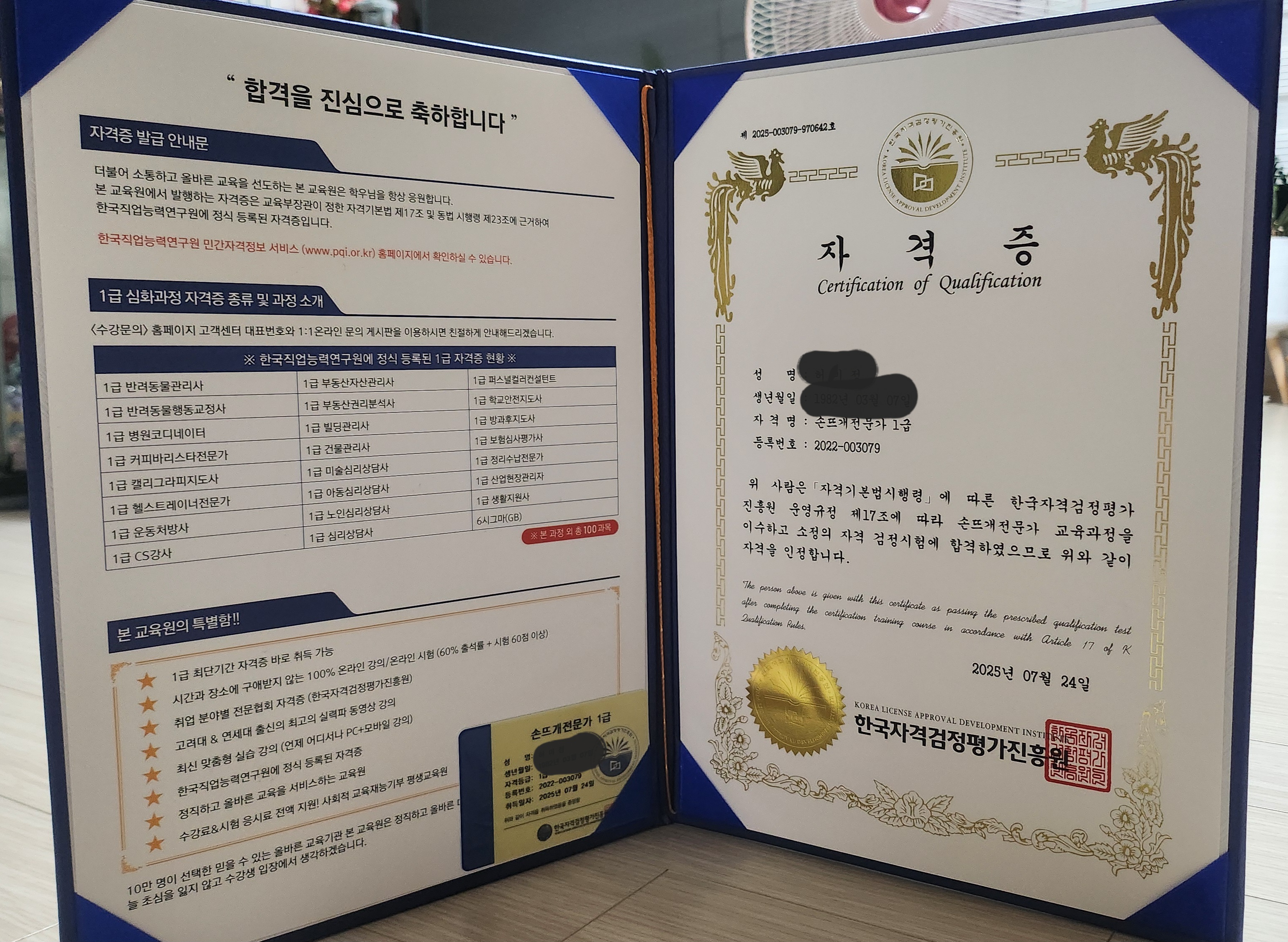 혼자 공부 했으면 흐지부지 했을텐데... 국민교육복지센터 덕분에 편안하고 빠르게 자격증 받을 수 있었어요!! 짧은 이력에 한 줄 넣을 수 있어서 기분 좋네요!!