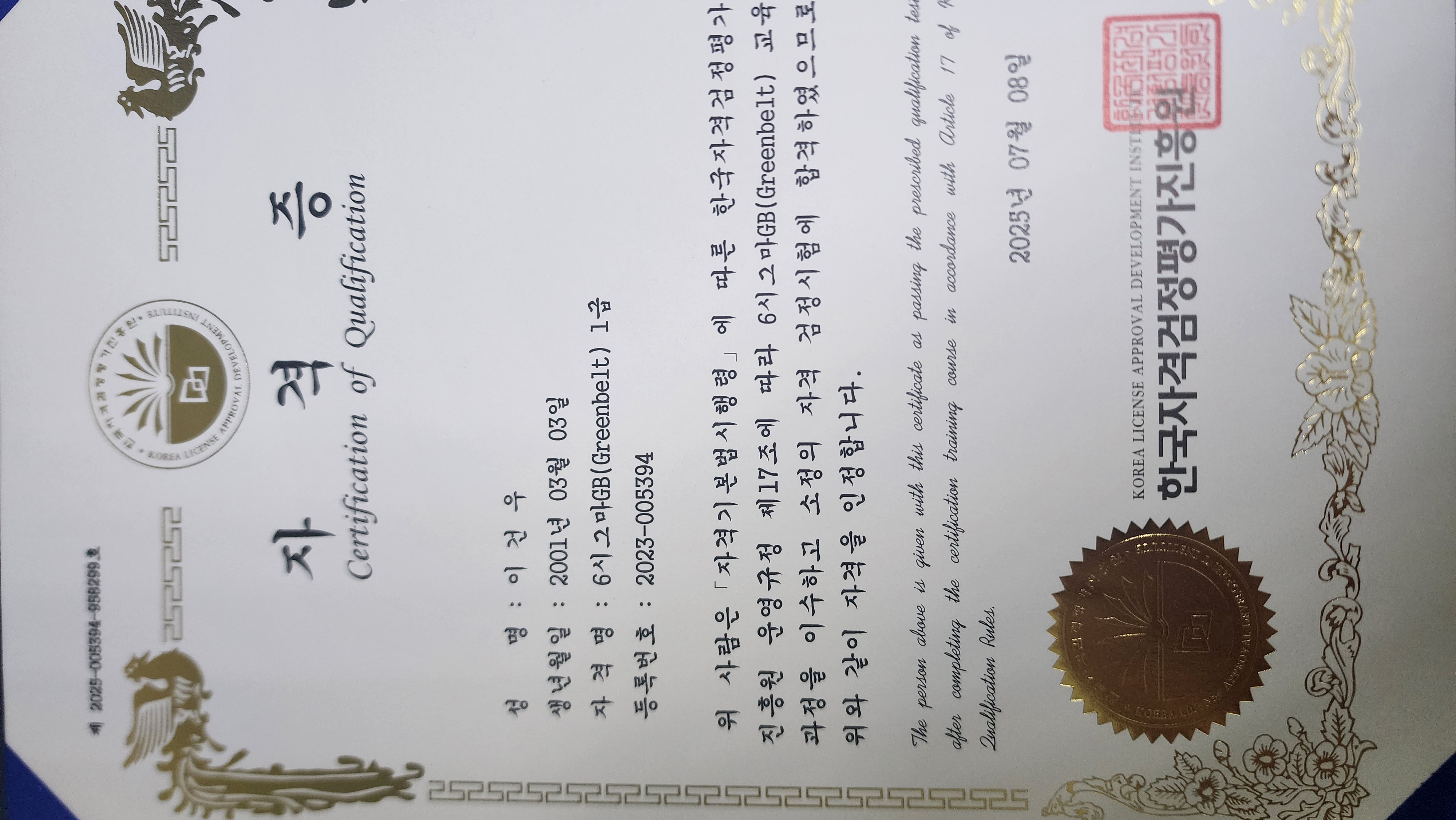 취업을 하기 위해 국가자격증 이외의 자격증을 알아보다가 6시그마 자격증이 있다는 것을 알게 되었고 열심히 강의듣고 6시그마 GB자격증을 취득했습니다. 앞으로 6시그마 BB과정까지도 취득할 생각입니다!