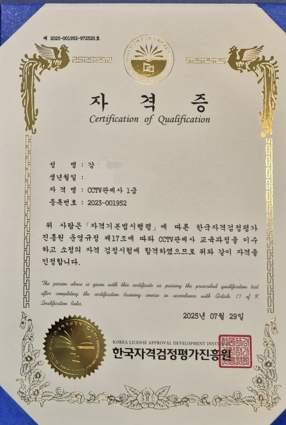 현대인은 수많은 cctv에 노출되어 있습니다. 보이지 않는 위험으로부터 시민을 보호한다는 명목으로, 혹은 기후변화, 환경오염, 도시화, 산업화에 따른 비효율에 대처하기 위해 도시공간에 ICT융합기술과 친환경기술을 적용하여 도시기능을 효율화하고 도시문제를 해결하는 지속가능한 도시, 즉 smart city 구현하기 위함이라는 명분 때문이지요. CCTV의 효율적 운영관리를 위해 지자체의 기능부서별로 분산 운영되던 CCTV를 통합하여 운영하기 위해 만들어진 cctv 통합관제센터에 지원하고자 이번에 자격증을 취득했습니다. 공부하면서 cctv 관제사라는 직업은 계속 유망할 수 밖에 없을 거라는 생각이 들었습니다. 이번에 취업에 성공한다면 평생 직장이 될 것 같습니다. 강의를 듣는 것만으로도 생활하는데 많은 도움이 될 것 같으니 여러분도 도전해보시기 바랍니다.^^ 저는 이어서 집합건물관리사 1급에도 도전해볼 생각입니다.