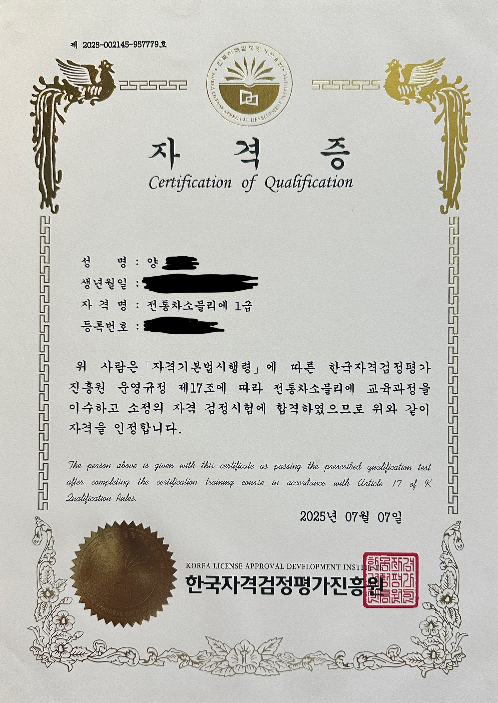 전통차소믈리에 1급