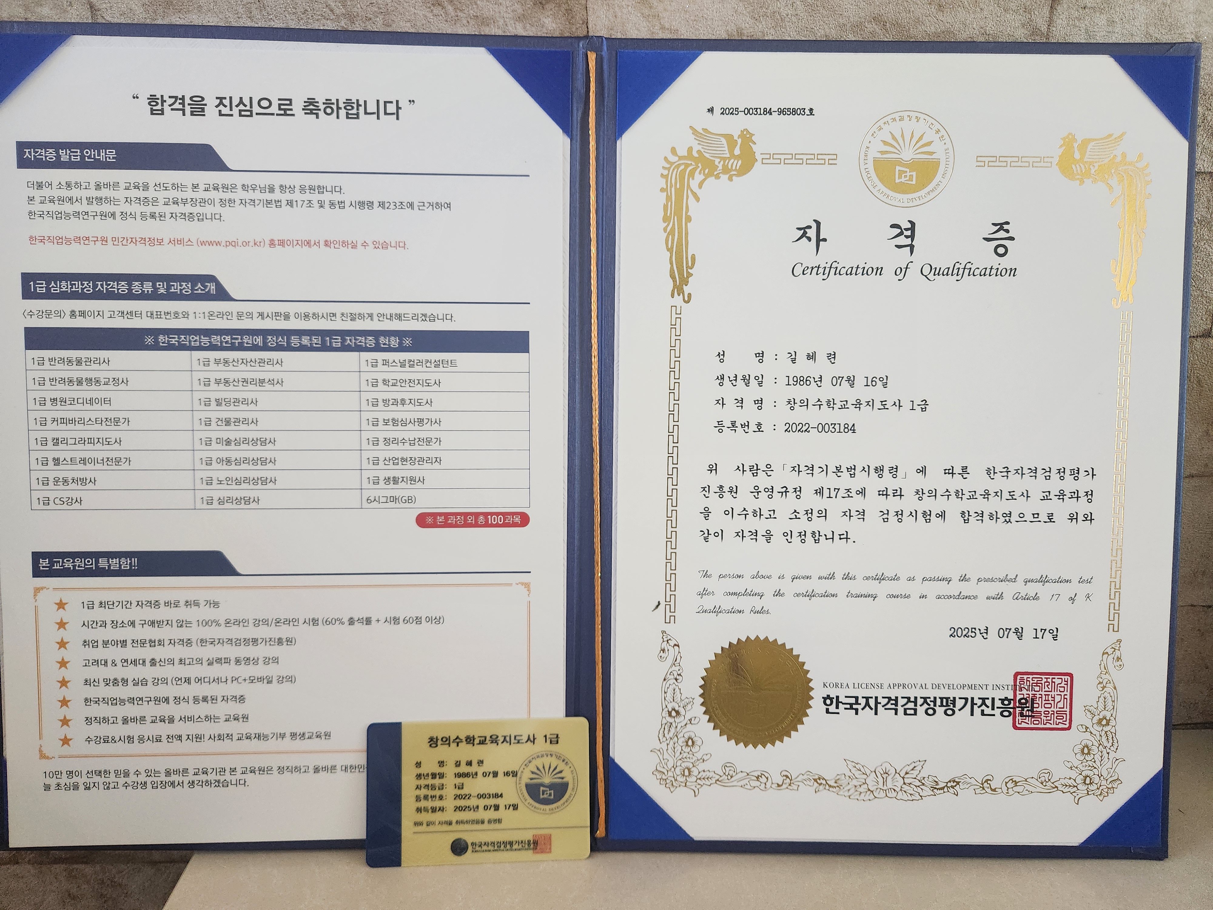 직장에서 몸을 다치고 퇴사하고 배운게 그것 뿐이라 앞으로 무슨 일을 하며 살아야할까 고민하던 차에 자격증 취득했습니다! 앞으로의 꿈을 키워나가는데 참 많은 도움이 되었습니다!!!