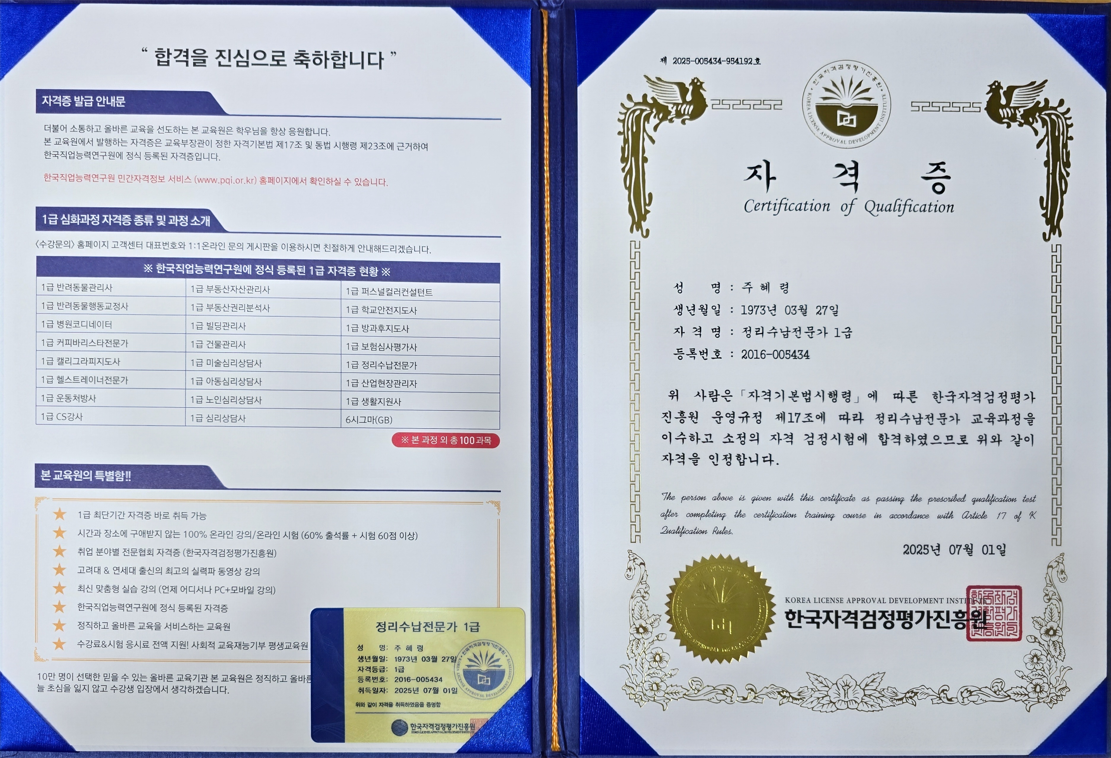 퇴직 후 무엇을 할까 고민하다 국민교육복지센터 발견했어요...직장 다니면서 오프라인 강의 들을 시간이 없는 저에겐 딱이었습니다. 고민하다 제가 좋아하는 정리수납전문가 1급 자격증 도전해서 취득했습니다. 강의만 잘 들으면 누구나 합격 하실 수 있습니다. 앞으로 다른 자격증에도 도전해볼까 합니다. 감사합니다.