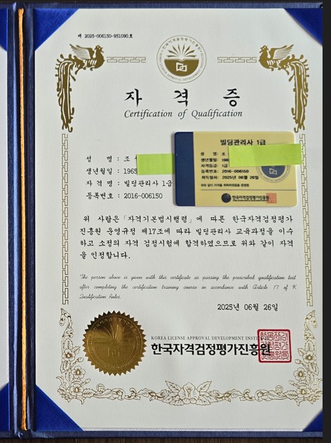 현재 빌딩 시설물 관리 기계설비유지 관리자로 근무를 하면서 조금이라도 시설관리 하는데 효과적이고 규정에 맞는 업무를 하기 위해서 빌딩관리사 자격증을 취득하게 되었습니다 강의를 들으면서 새로운 지식들을 얻을 수 있었고 좋은 정보 많이 얻으며 자격증을 취득하니 보람이 있었습니다 기회가 된다면 다른 자격증도 취득할 수 있도록 하겠습니다.