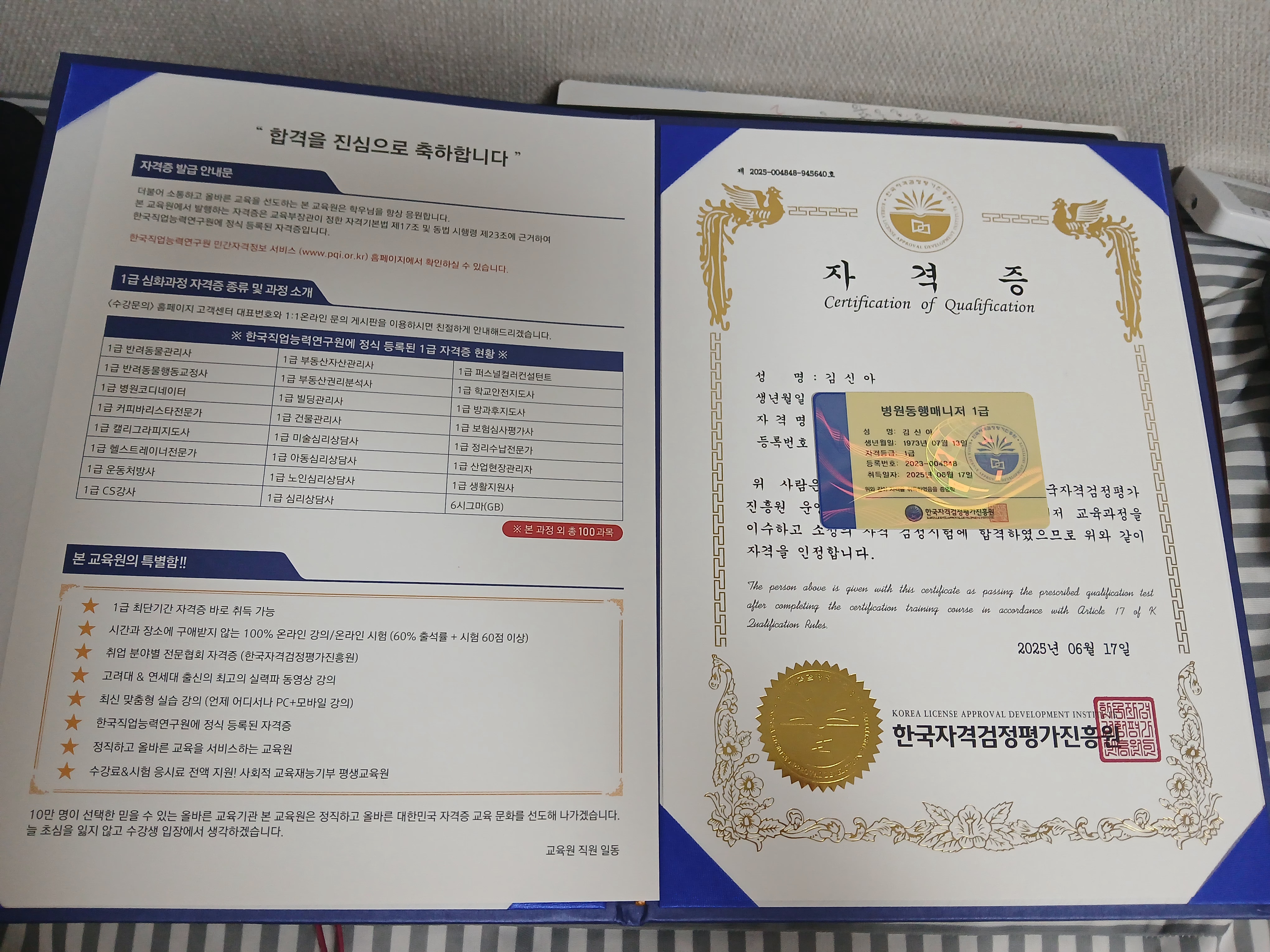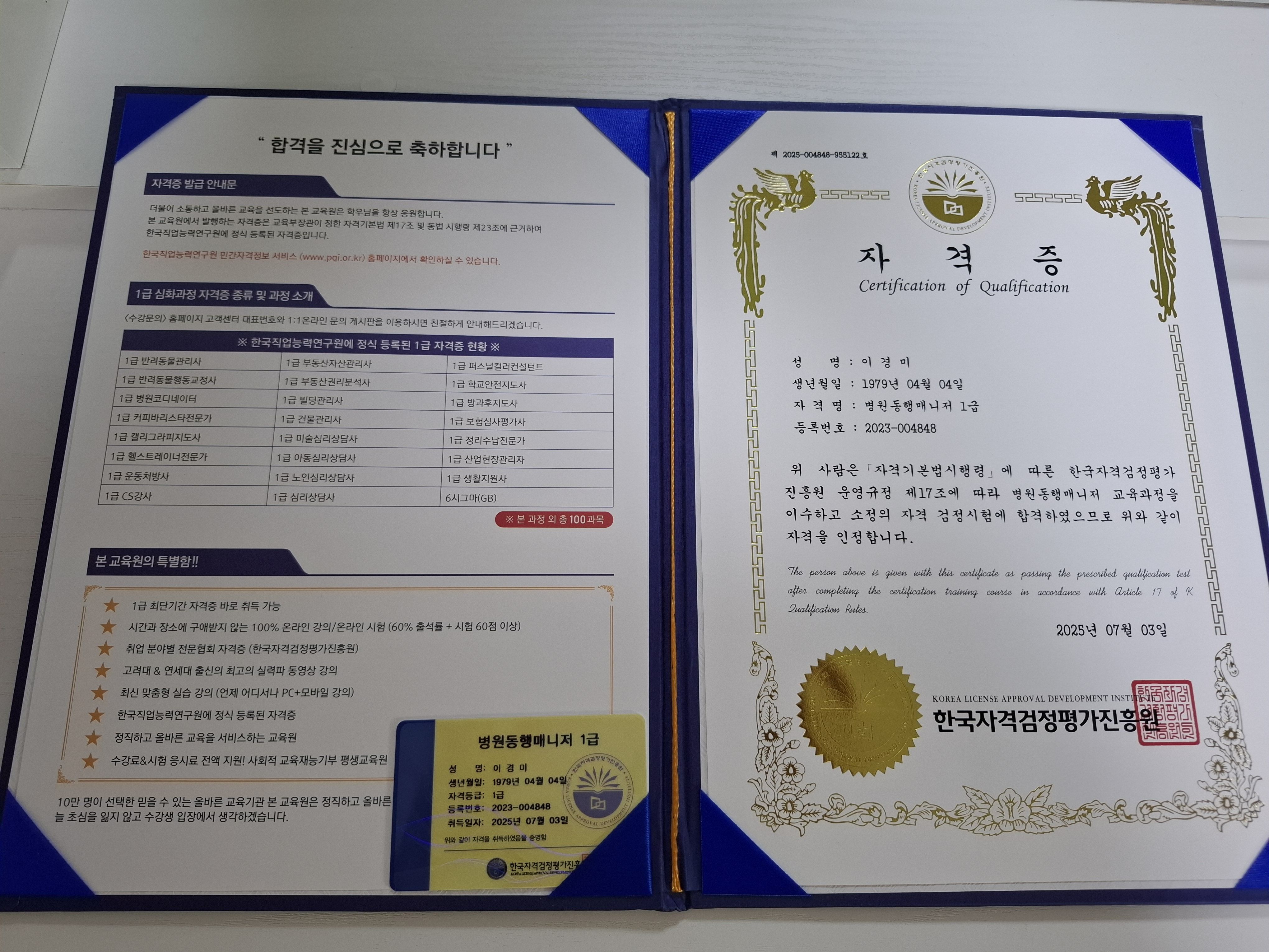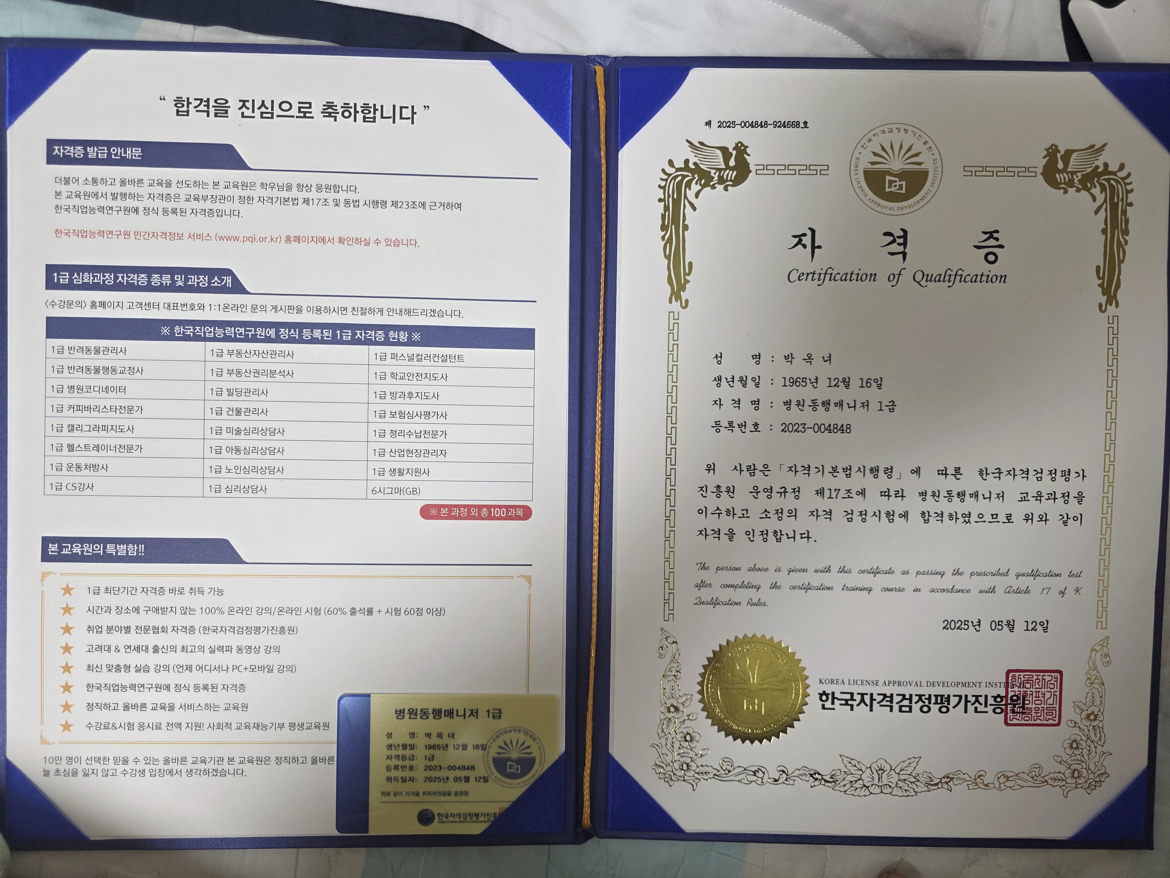 간병사자격증에 이어 뭐라도 따놓자 싶어 병원동행매니저 자격증 공부를하고 수강신청도 공짜로하고 합격하니 너무좋네요.어머니가 좋아하세요.~