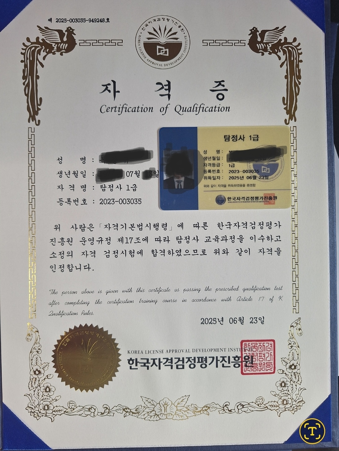 열심히 공부하여 탐정사 1급 자격증 취득 하였습니다.