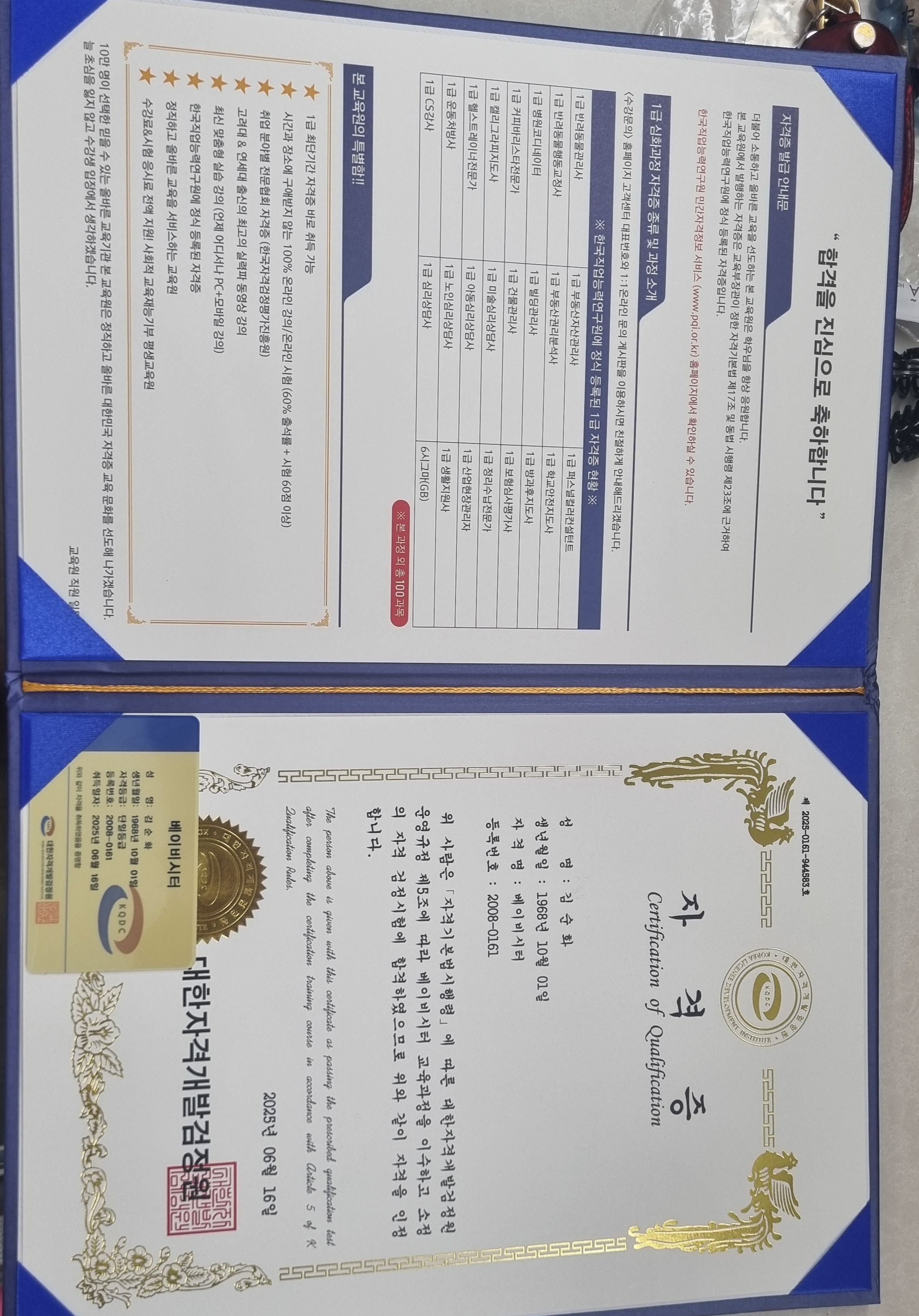 퇴직후 손주를 봐주면서 이런 자격증을 취득해놓으면 도움이 많이되겠다싶었는데 이런 좋은 기회가 생겨서 너무 좋았어요 강의도 너무 재미있고 쉽게 설명해주신덕분에 자격증도 취득하게되었고 친구들한테도 많이 알려주었고 또 다른 자격증을 취득해야겠어요~
