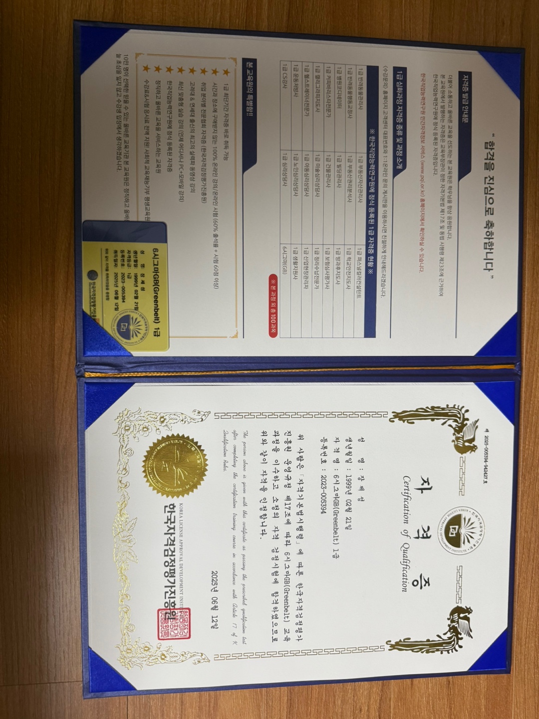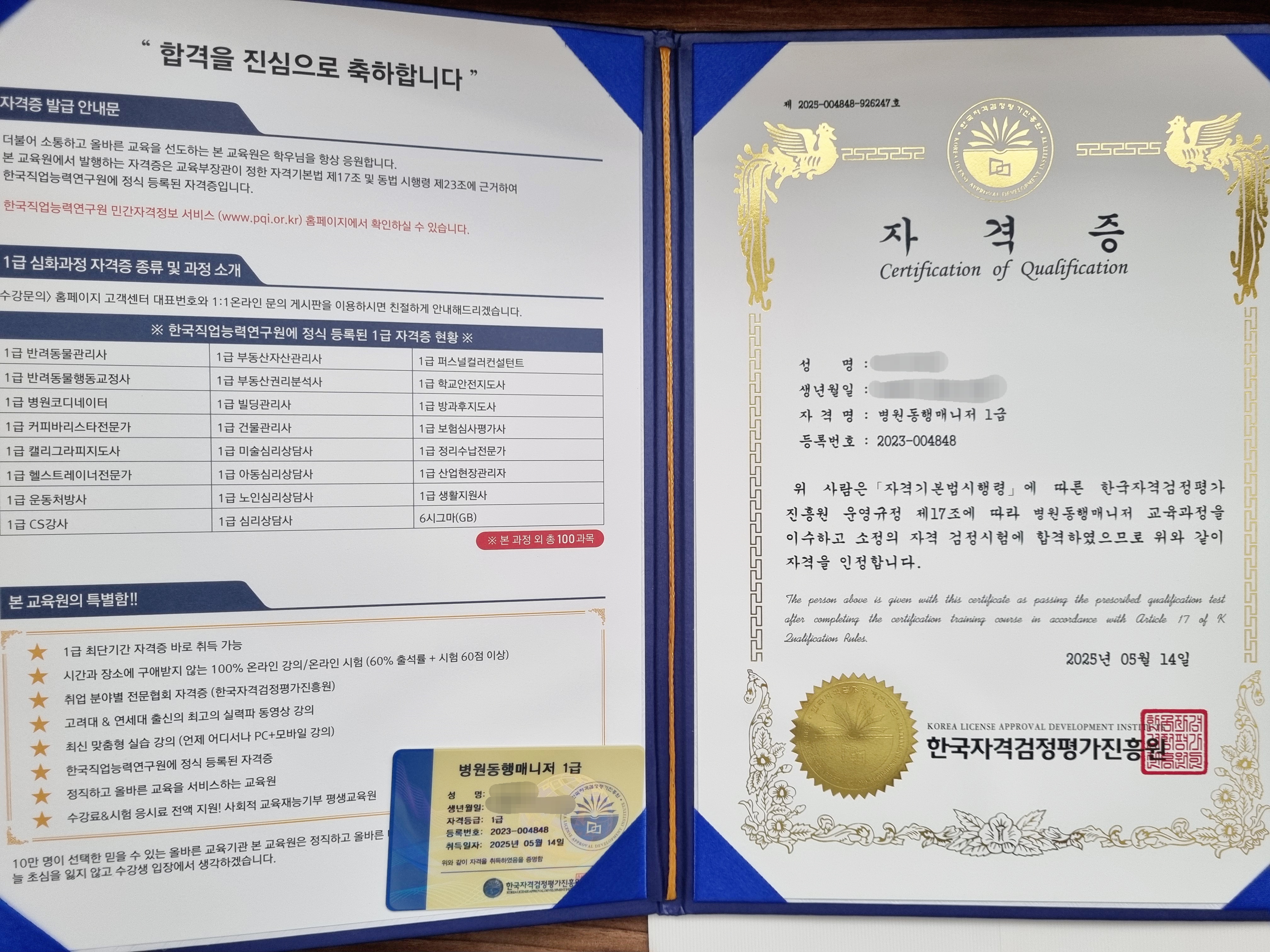 수강한지 2주도 안되서 자격증 취득했습니다! 실제 업무에 필요한 부분도 알 수 있었고, 자격증이 있으니 병원동행업부 지원할때 자신감도 생깁니다 ^^ 정성스럽고 고급지게 자격증이 도착했네요~ 다양한 수업들을 무료로 들을 수 있어 너무 좋아요! 언제든 반복재생해서 다시 볼 수있으니 더 좋구요 ^^