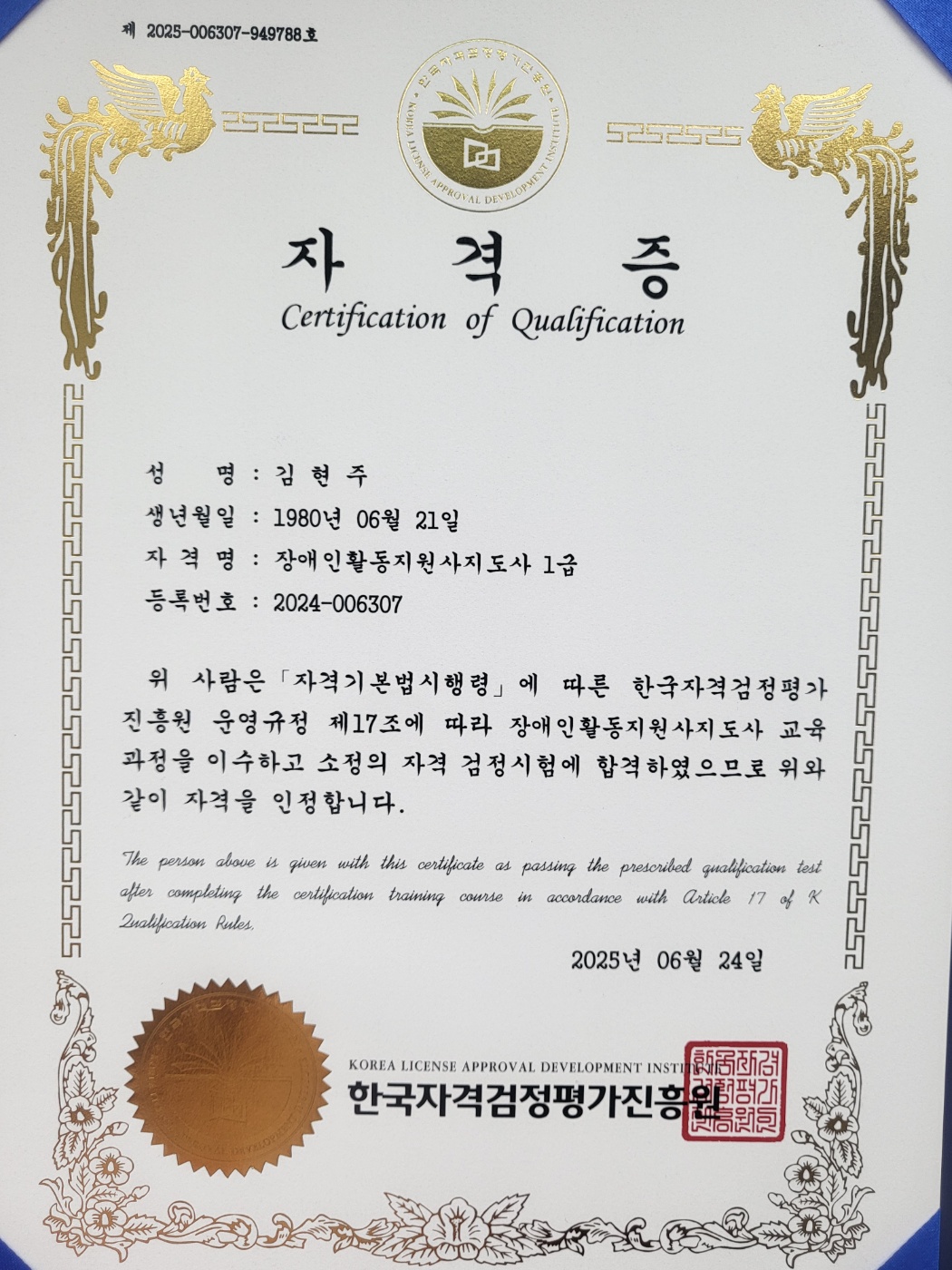 경리 일을 하다가 사회복지 쪽 일에 관심을 가지고 일을 시작하기 전에 필요한 자격증 공부를 하고 잇습니다. 다른 자격증에도 또 도전해 보려고 합니다.