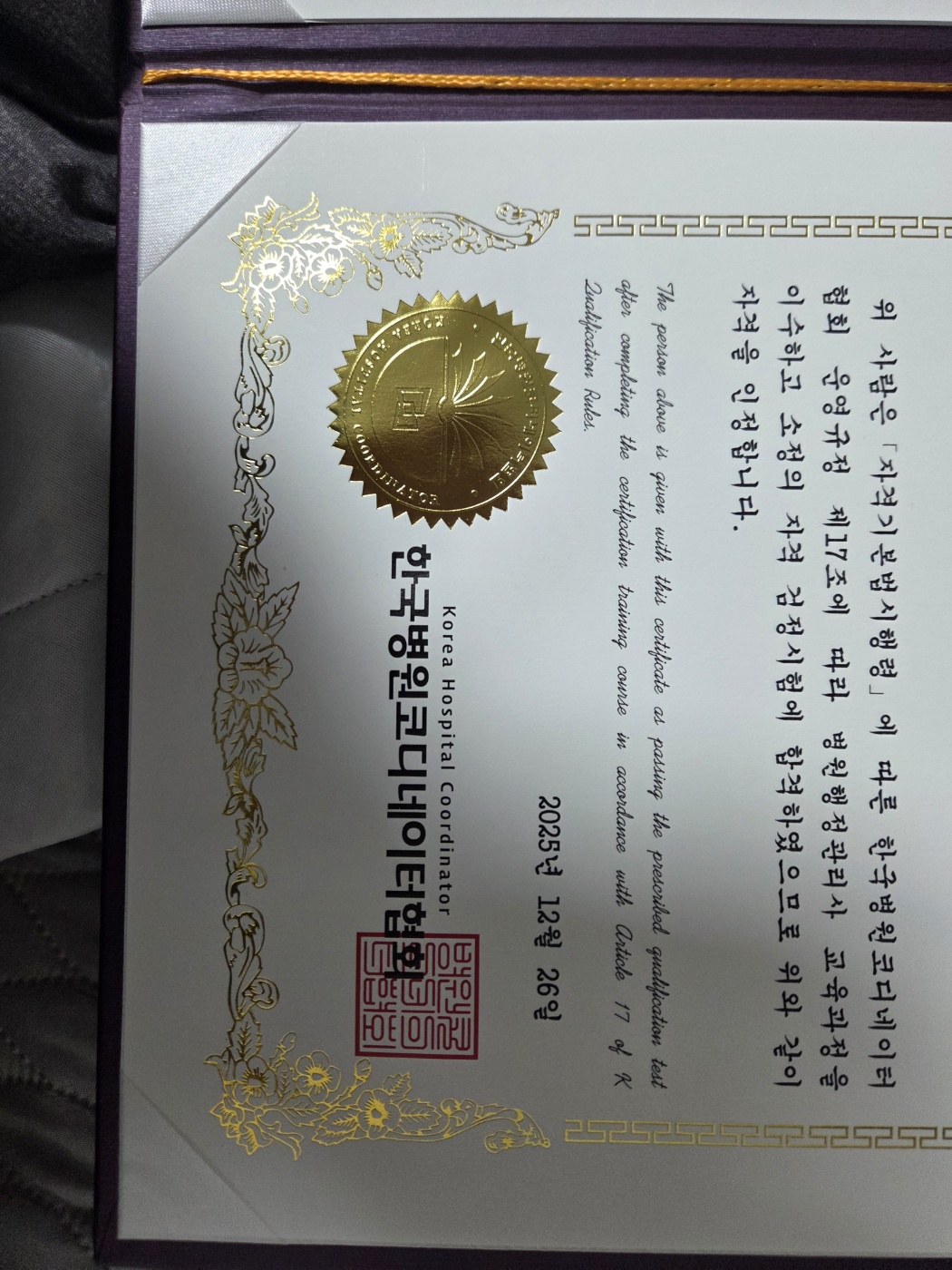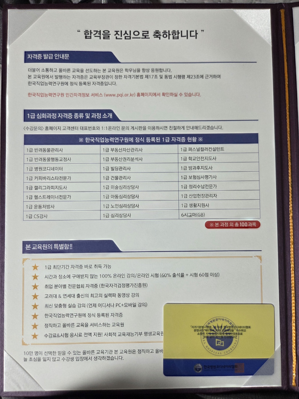 병원에 근무하면서 배우고 싶은 내용들이 있어는데 어떻게 해야할지 몰랐는데 우연히 검색하다가 들어오게 됬어요. 처음엔 동영상보면서 지식만 쌓이다가 시험 조건이 주어지고 호기심에 응시 했습니다. 그런데 저에게 멋진 자격증을 선물로 주셨네요. 감사드립니다. 제 업무에 많은 도움이 되었습니다. 또 비용도 저렴하게 자격증까지 받게 되니 너무 기분이 좋네요. 이참에 저를 위해 더 배워볼까합니다.