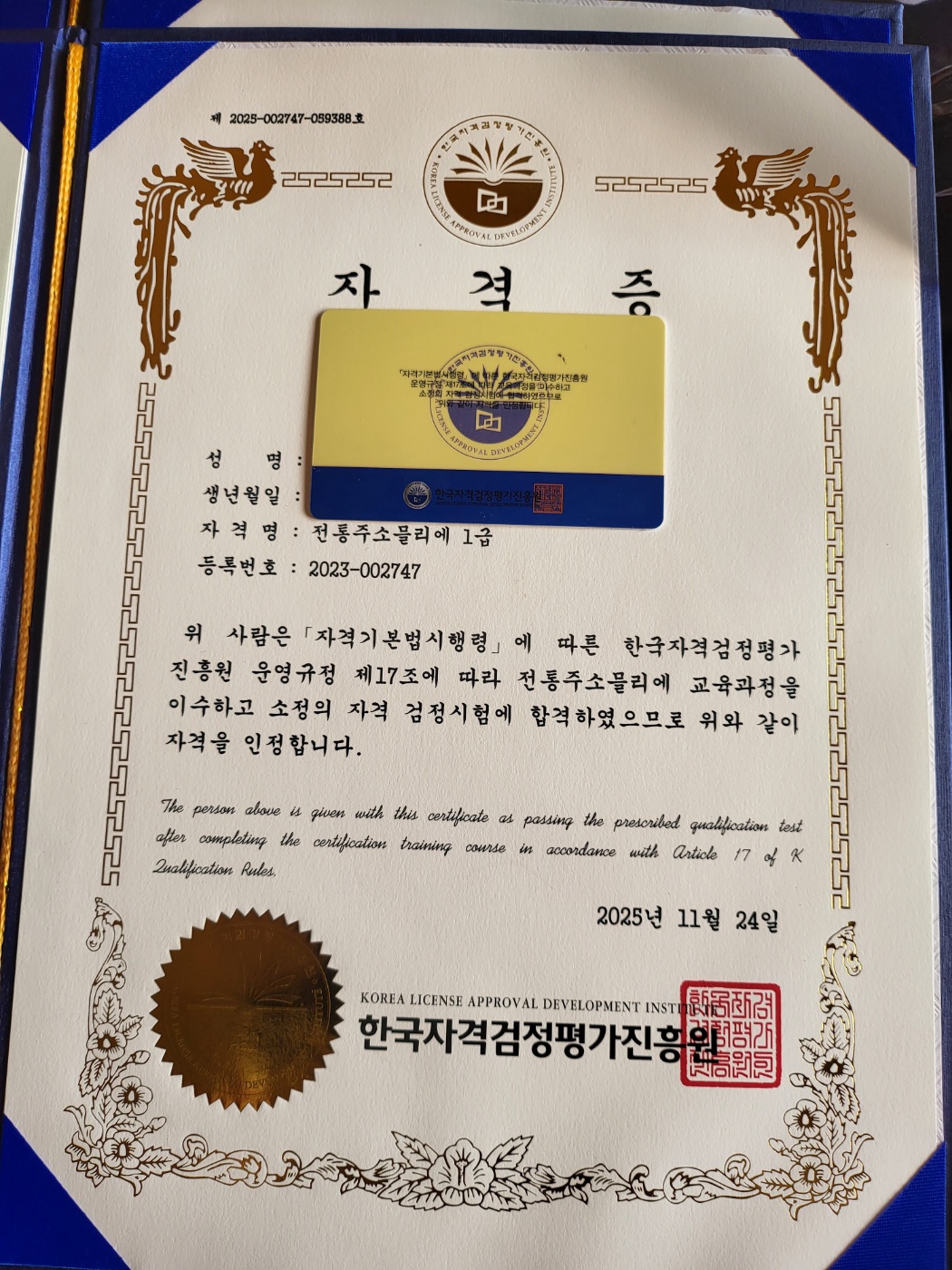 전통주 소물리에 자격증 취득하고 자랑했어요. 학교에서 농식품관련 발표가 있어서 막걸리 만들어 발표했는데 자격증이 한 몫 했네요. 자격증도 너무 고급지게 만들어 카드까지.. 고맙습니다.