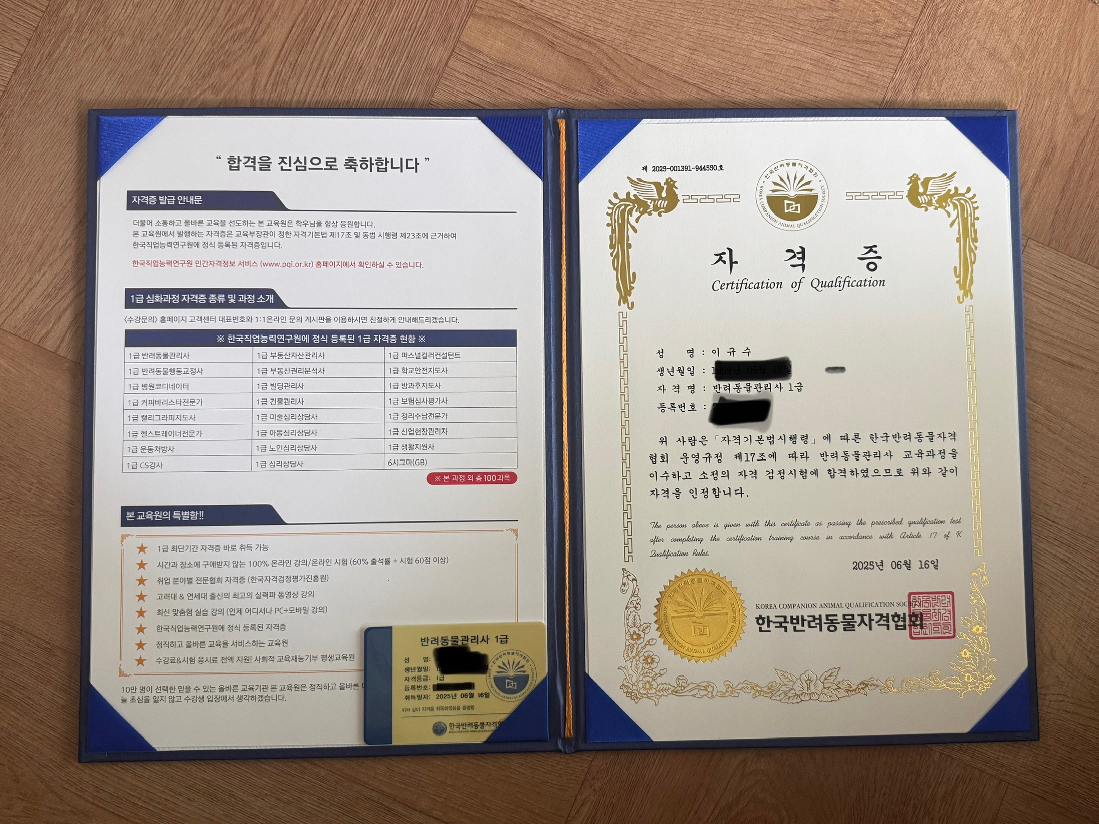 동물에 관심이 많고 더 많이 동물들을 알아가고 싶어서 따고 싶었던 자격증 입니다.