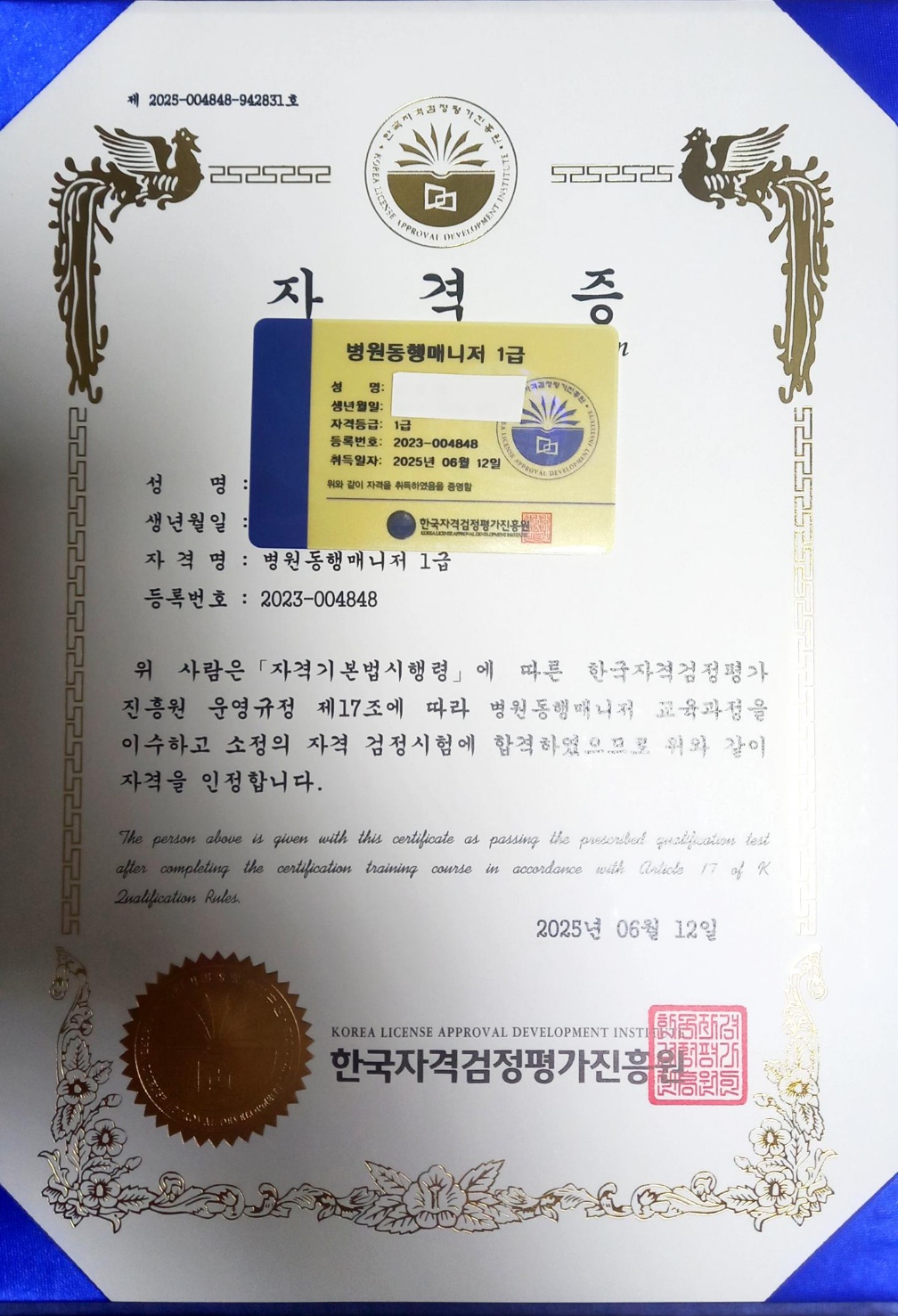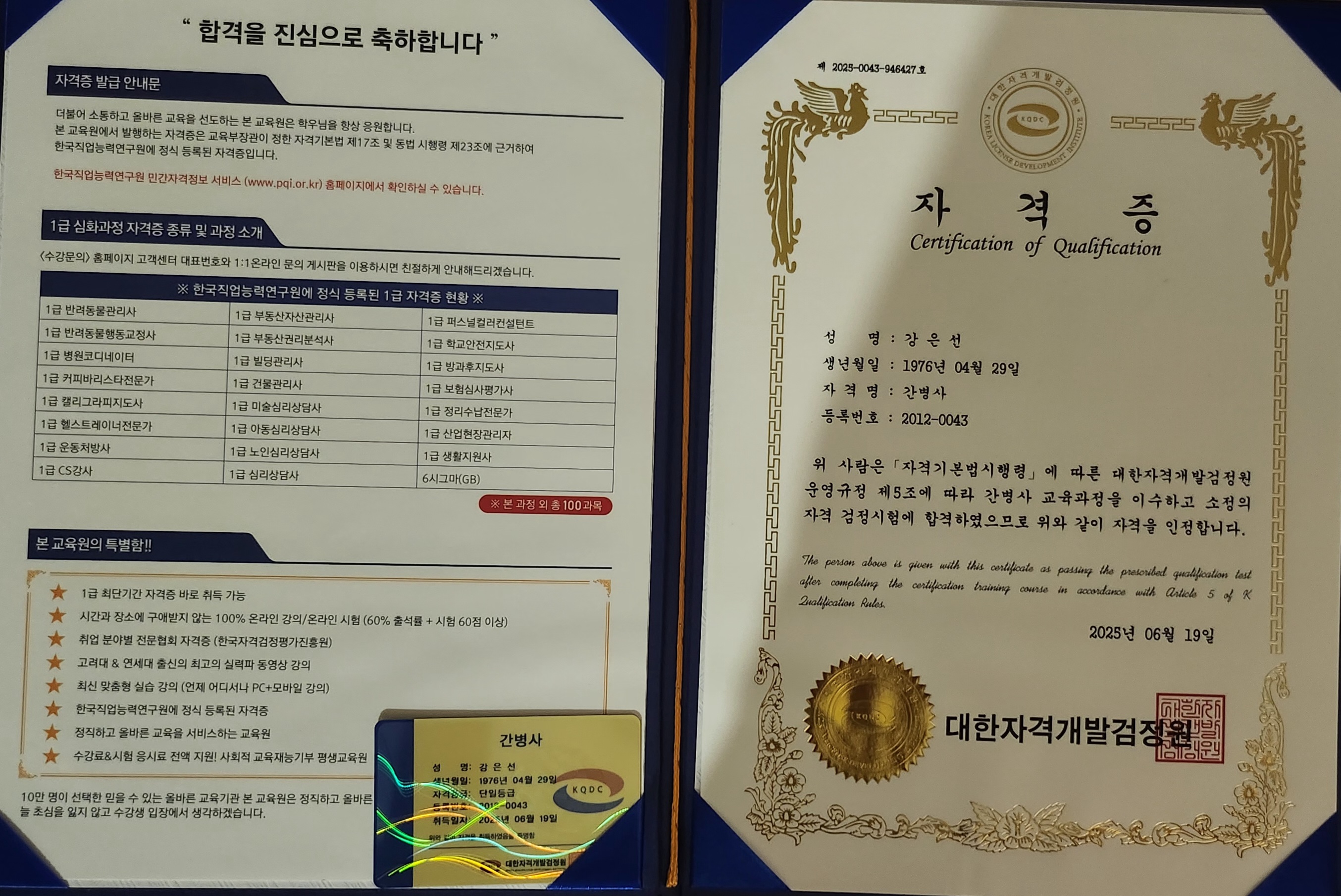 병원 관련 자격증에 도전하고 있습니다. 제일 처음으로 간병사 자격증을 취득했습니다. 강사님의 강의도 너무 귀에 쏙쏙 들어오고 교안 다운받아 다시 한번 읽어보고 기출문제 풀어보고 시험 봤더니 100점 이었어요. 다른 자격증도 계속 도전하고 있습니다.