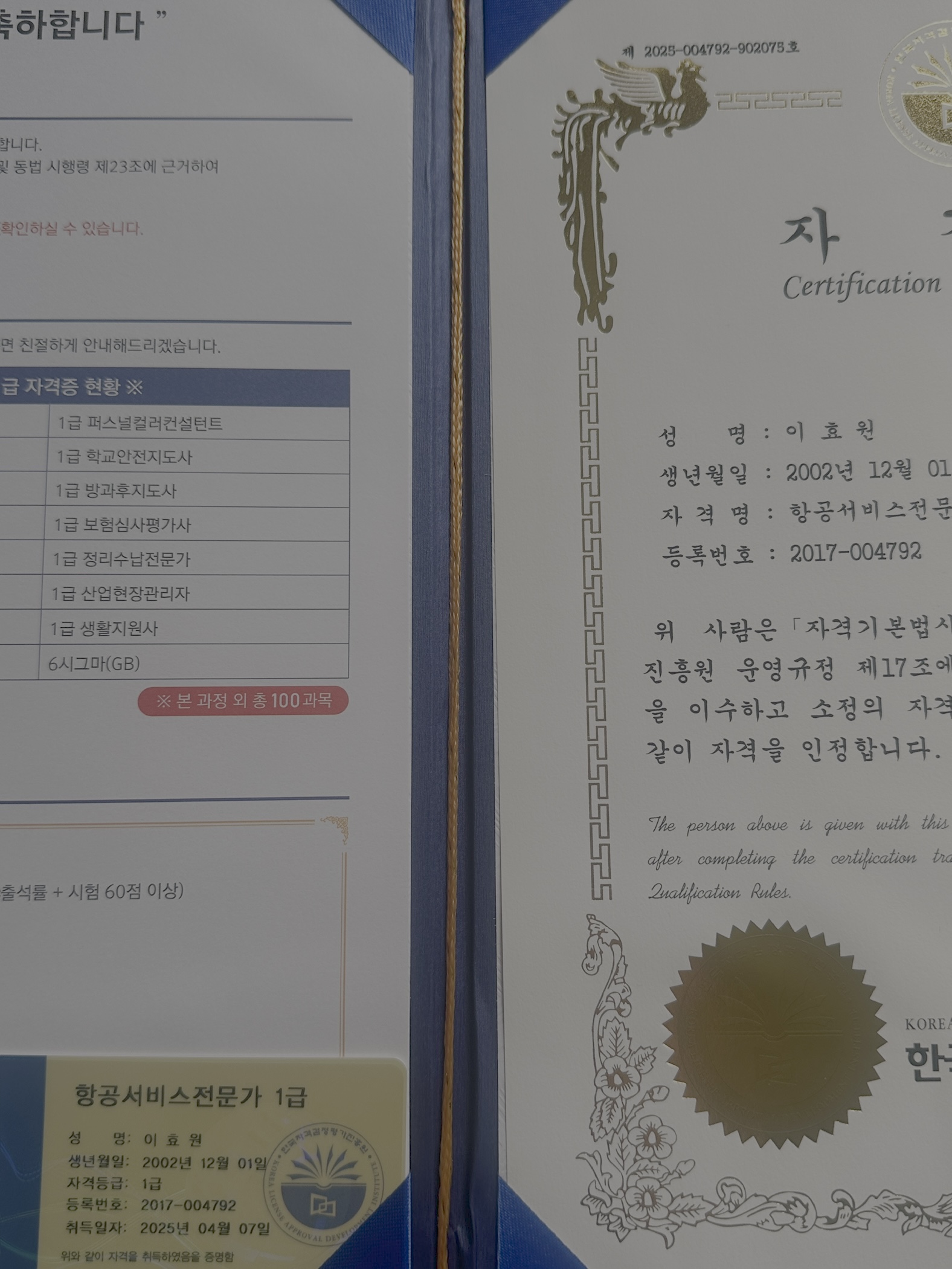 집에서 편하게 시간될 때마다 강의 보고 공부해서 항공서비스전문가 1급 자격증을 취득했어요! 수강료도 없어서 너무 좋았고 다른 자격증도 취득하고 싶어요