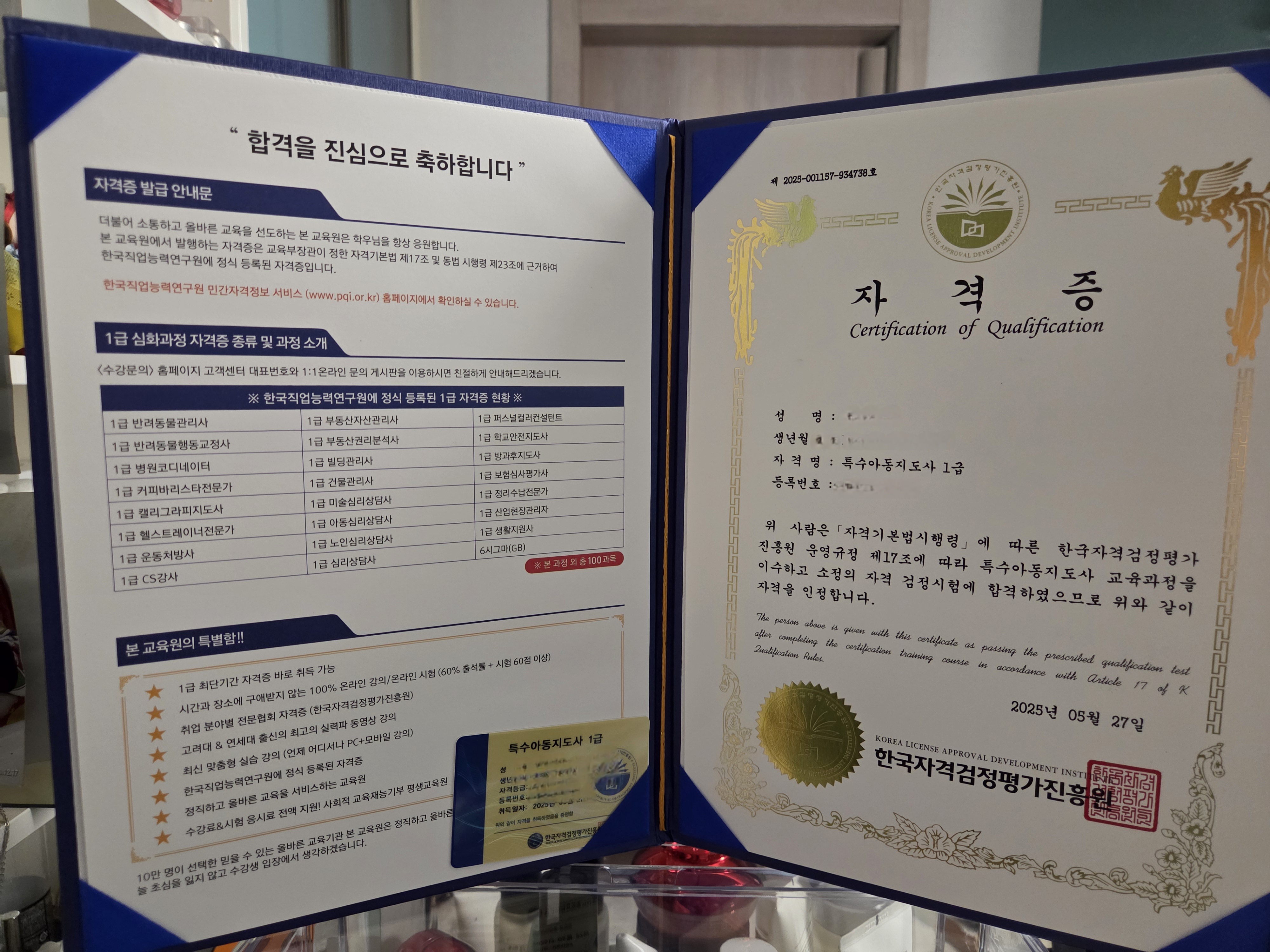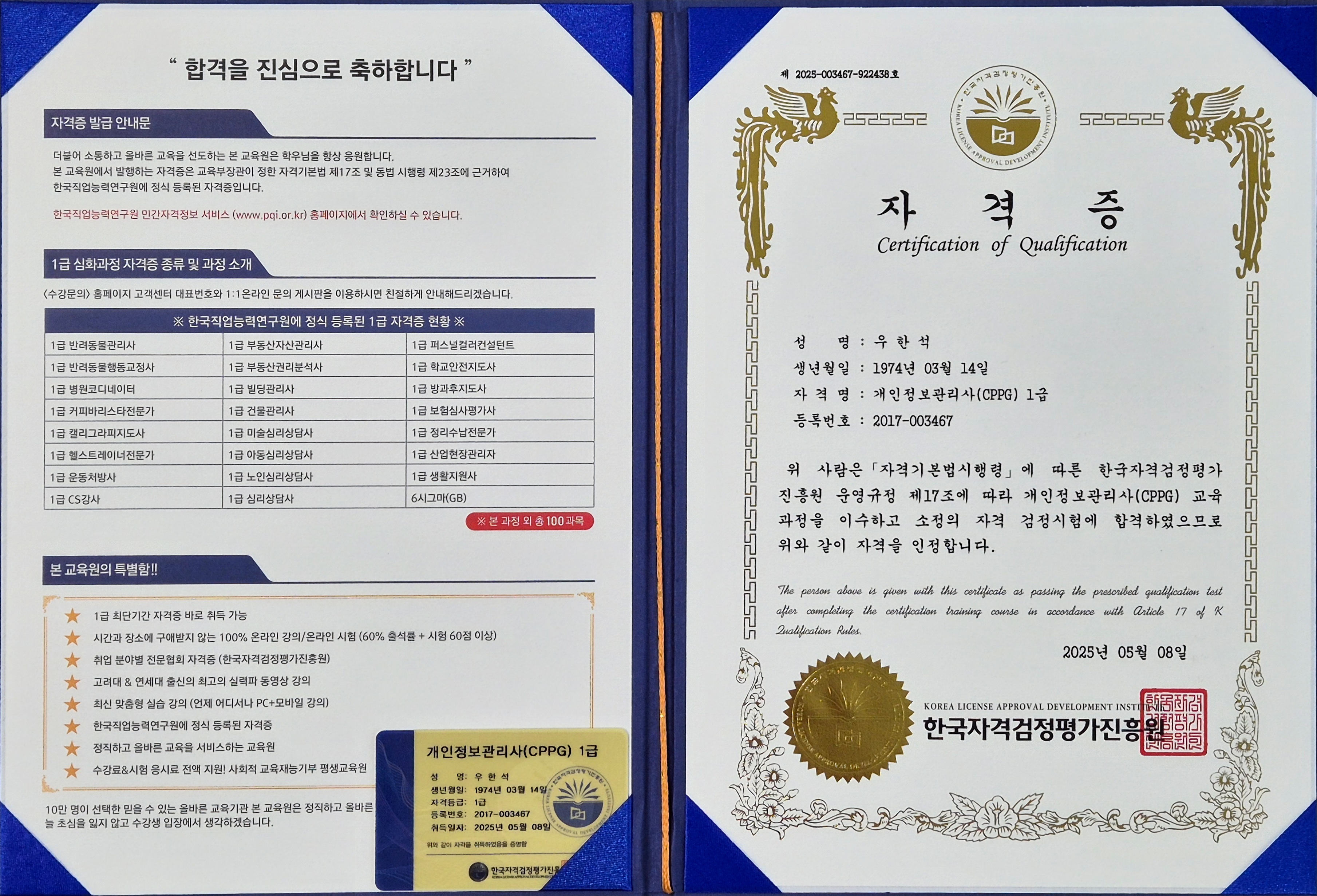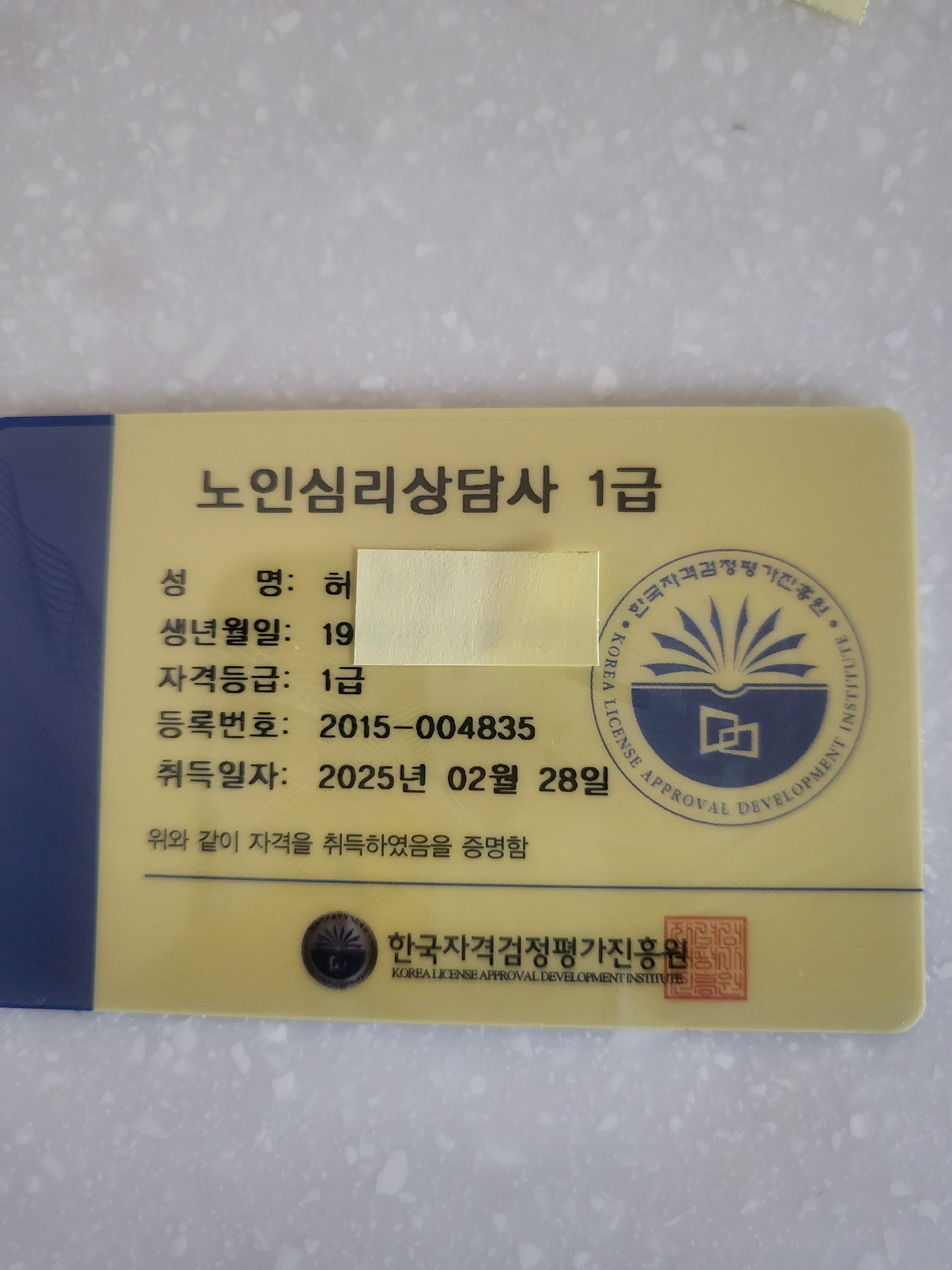 전부터 취득하고 싶었던 자격증이었는데 드디어 합격했네요ㅎㅎ 민간자격증이어도 여러곳 알아보고 비교해서 선택했던 곳이네요 자격증도 두가지 스타일로 발급해주셔서 더 값진 보람이 느껴졌습니다~ 이제 더 많이 활용할 일만 남았네요 다른분들도 고민하지마시고 여기서 취득하세요^^