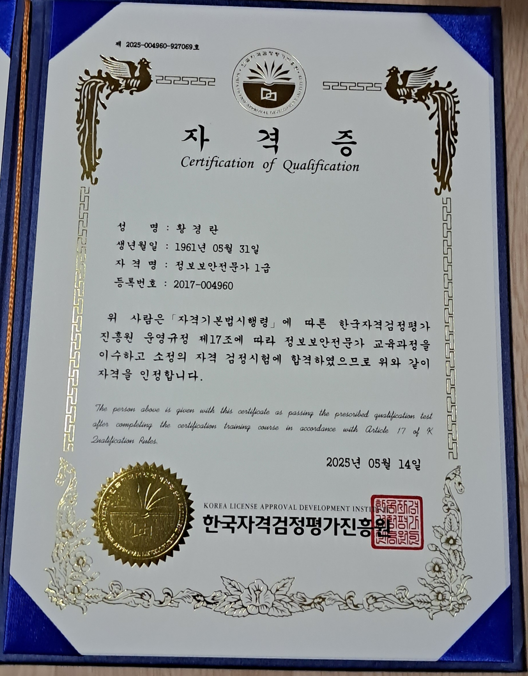 안녕하세요! 저는 30년의 직장생활을 마무리하는 단계에 접어들고 있는 시점에 있습니다. "국민교육복지센터"에서 실시하는 강의를 통해 개인정보관리사자격증을 취득하여 현재 종사하고 있는 유사한 분야에서 계속 일을 할 수 있는 여건을 구비하게 되었습니다. 명쾌하고 수준높은 강의를 해주셔서 단번에 합격할 수 있게 해주신 강사님께 진심으로 감사드립니다.