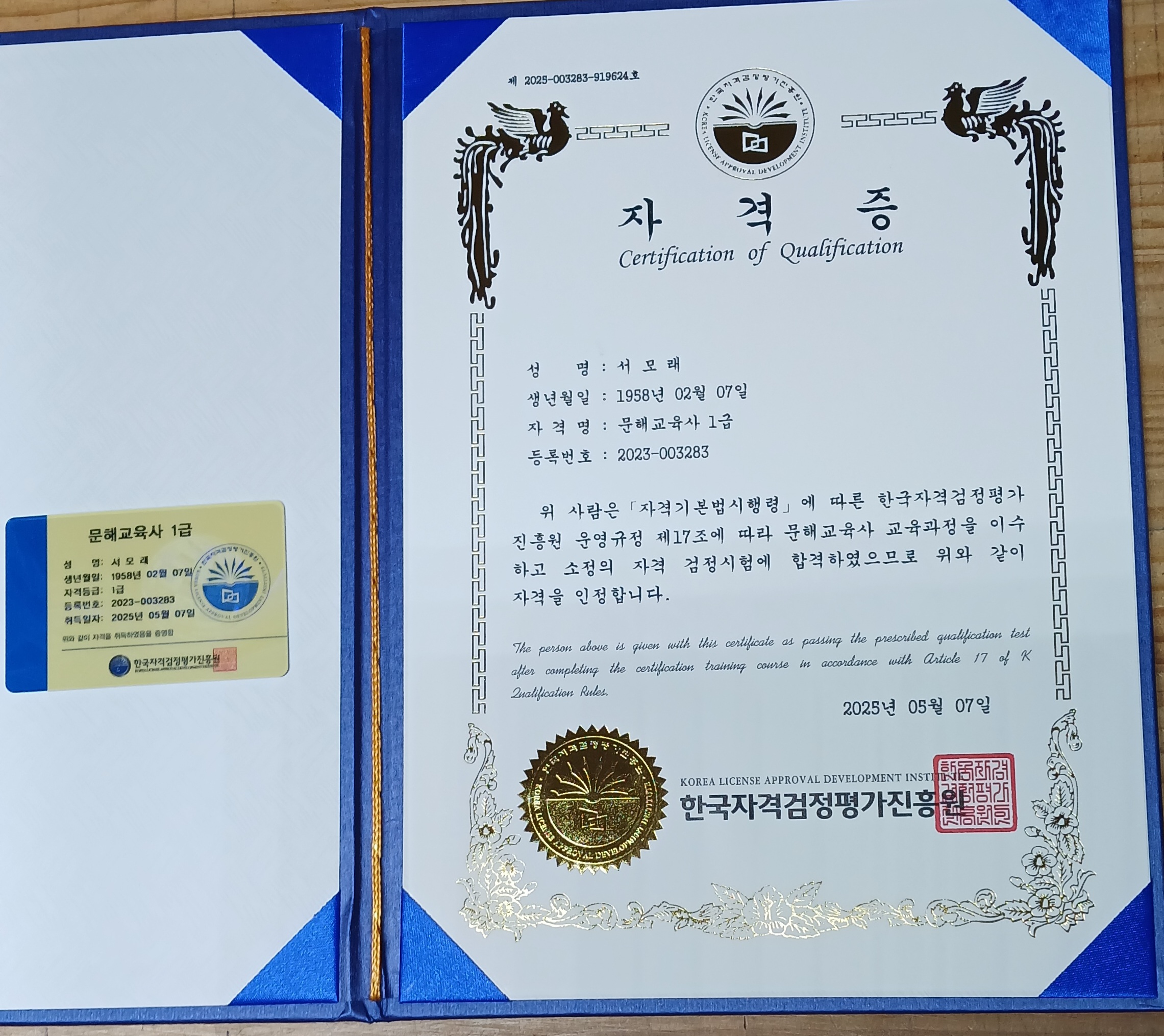 문해교육사 3급을 취득하고 강릉성덕등불학교에서 기초반 강의를 시작한 새네기교사 입니다 자격증을 취득하고 5년후 다시 2급을 취득하는 줄 알았는데 성덕등불학교에 재직하시는 선생님께서 정보를 주셔서 바로 시작했어요 문해교육사 강의하시는. 정교수님 ! 강의를. 듣게 되어서 큰 힘이 되었습니다 교수님 ! 강의. 잘 듵었습니다 감사합니다