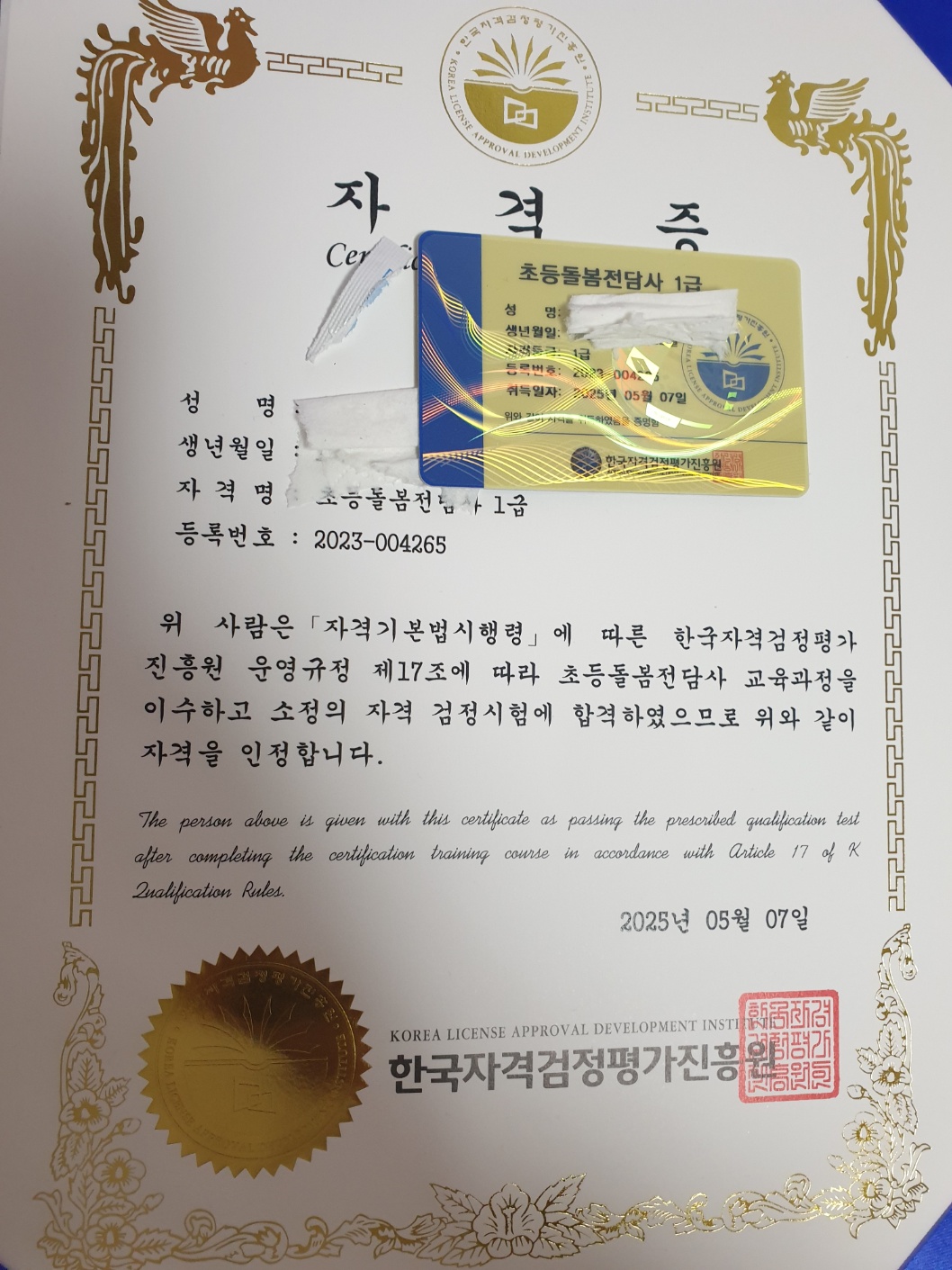 오랫만에 열공해서 받아든 자격증이라 뿌듯한 마음에 제 자신에게 토닥임을 주었습니다. 아울러 이런 기회를 주신 국민교육복지센터께 그리고 열심히 지도해주신 길유정교수님께 감사를 드립니다. 이계기로 아동미술지도사를 신청해서 또다른 목표를 가지고 시작하려고합니다. 감사합니다^^~
