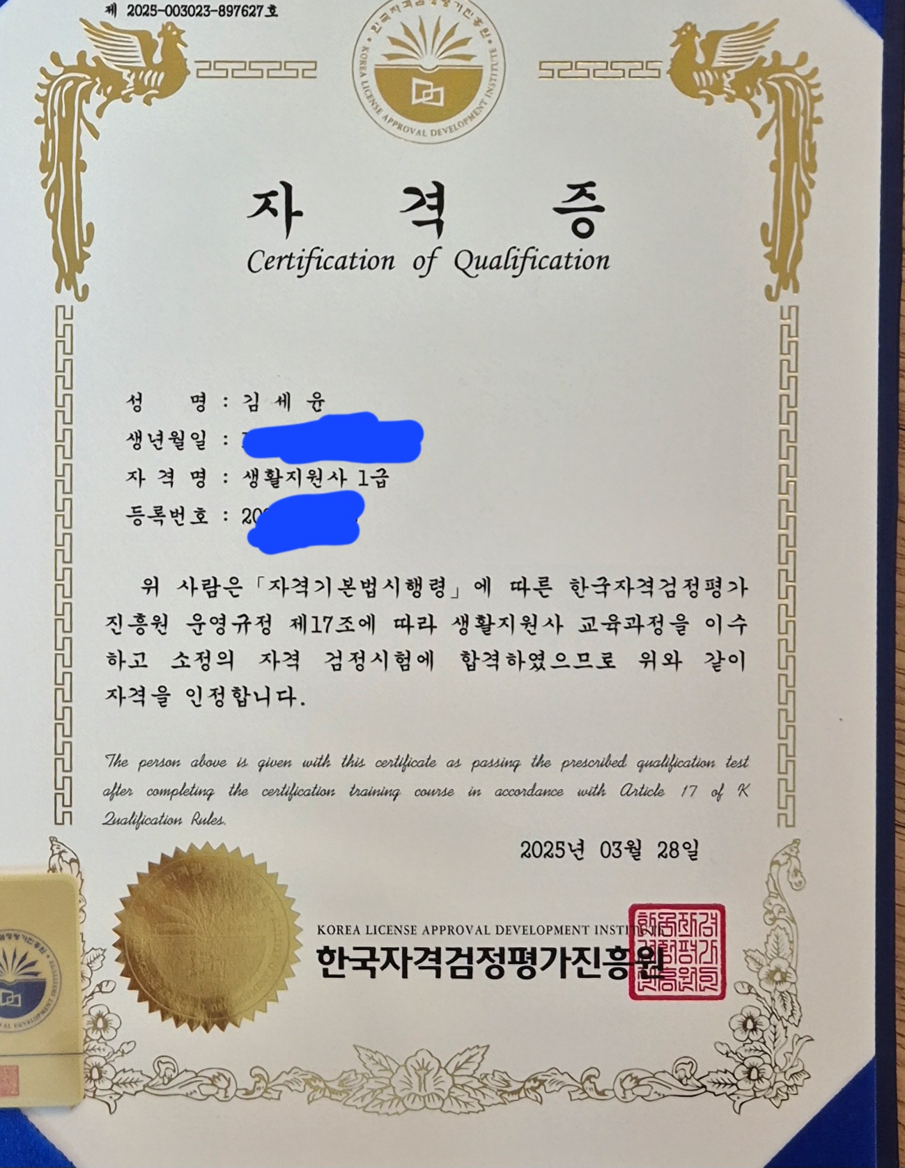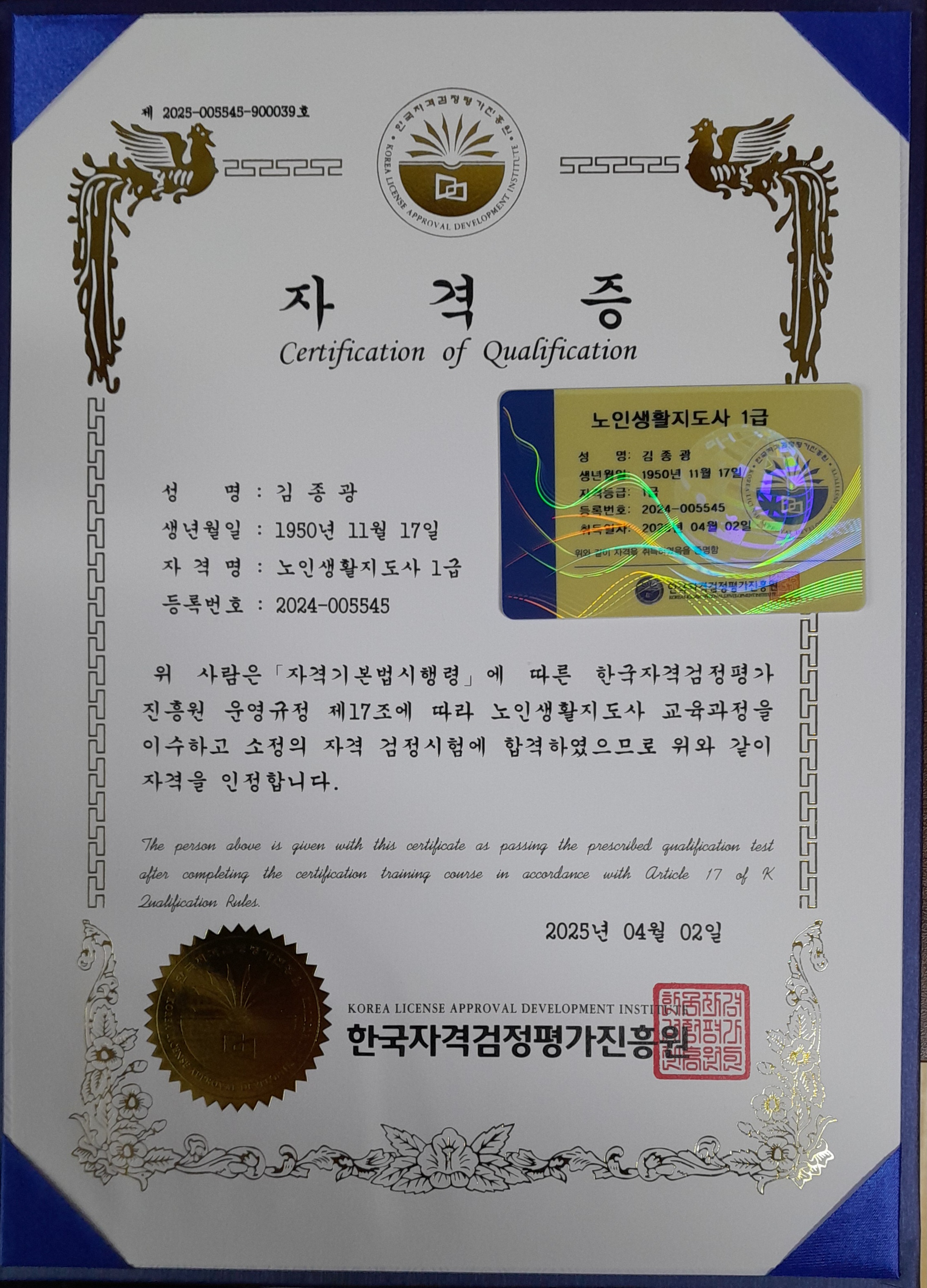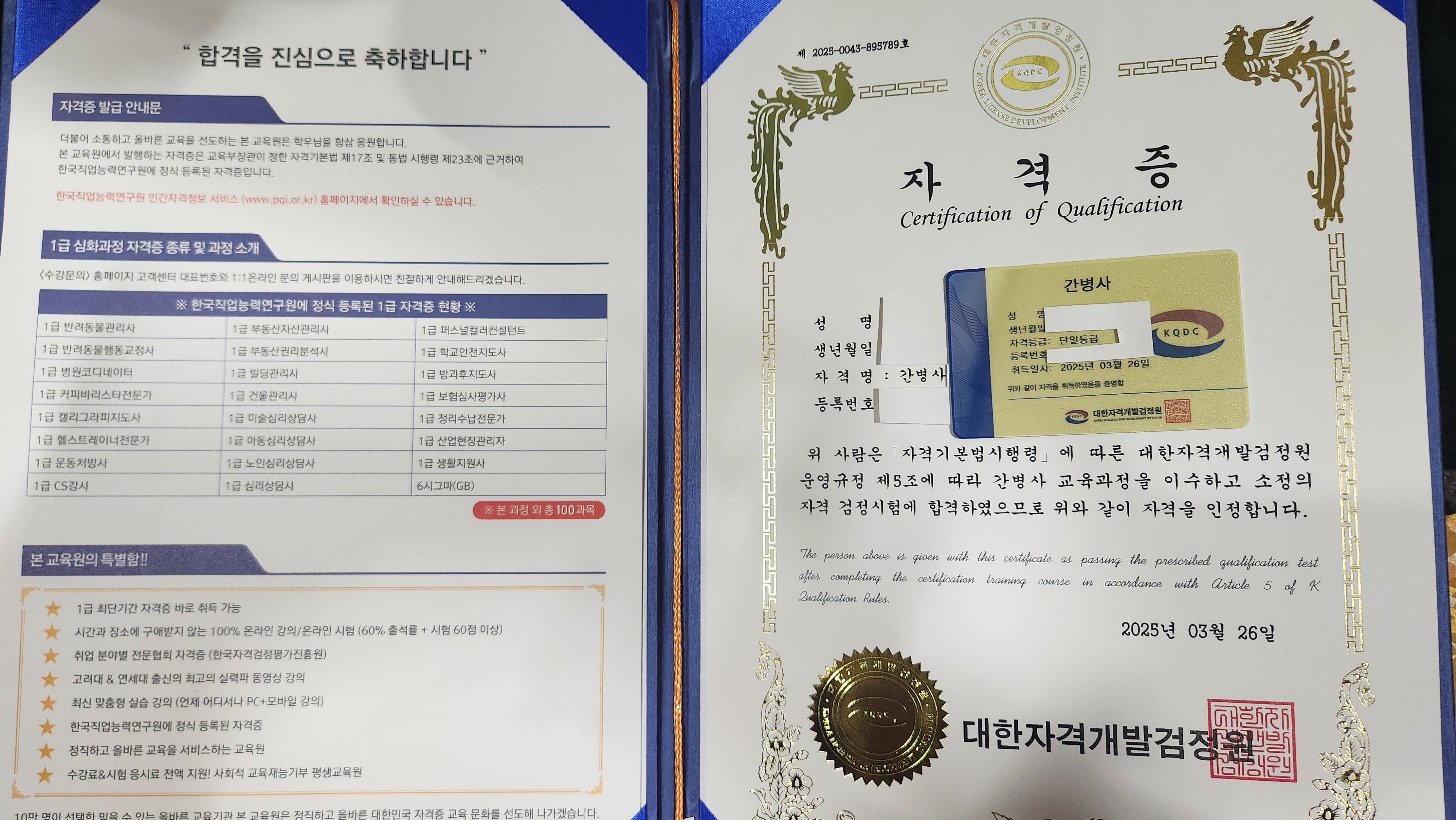 노인 돌봄 관련 일을 하는 데 치매 노인을 돌보고 있어 그 분들의 특성을 좀 더 이해할 수 있어 도움이 되고 강의 잘 가르쳐 주시고 하셔서 좀 더 집중을 잘할 수 있게 되어 강의 잘 듣고 시험에 응시했는데 합격의 영광을 안게 되어 너무 기쁩니다. 배움에는 끝이 없다는 걸 깨닫습니다. 다른 강의(노인심리상담사1급,생활지원사1급 등)도 지금 수강 신청해서 배우고 있어요. 관련된 일을 하니 더 쏙쏙 귀에 들어옵니다. 직장인들 바빠서 학원에 다닐 시간이 안되는 분들은 이 곳이 딱 알맞은 곳이네요. 미래를 위해 투자하는 시간이라 즐겁게 잘 배우고 있습니다. 감사합니다.