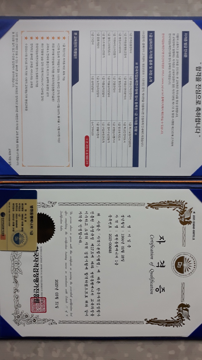 3일도안되서 자격증을 딸수있어 좋아요,모르던 내용도 알게되고 자격증도 9만원에 너무 재질도 좋음.감사합니다