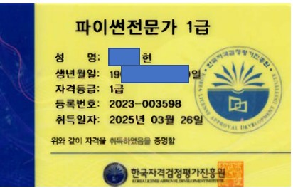 최근 데이터 분석 분야 자격증 중에 매우 인기가 있는 자격증이 아닌가 싶습니다. 자격증 받고 보니 개인자격증 번호가 기재 없다는 것이 타사 자격증과 비교 되는 것 매우 아쉬운 부분이긴 하지만, 강의 과정으로 본다면 강사님의 탄탄한 강의 실력으로 커버가 되는 과정인것 같습니다. 구글 코랩 환경에서 실습을 할수 있었고 시험준비는 크게 어려움이 없었던 없었던것 같습니다.