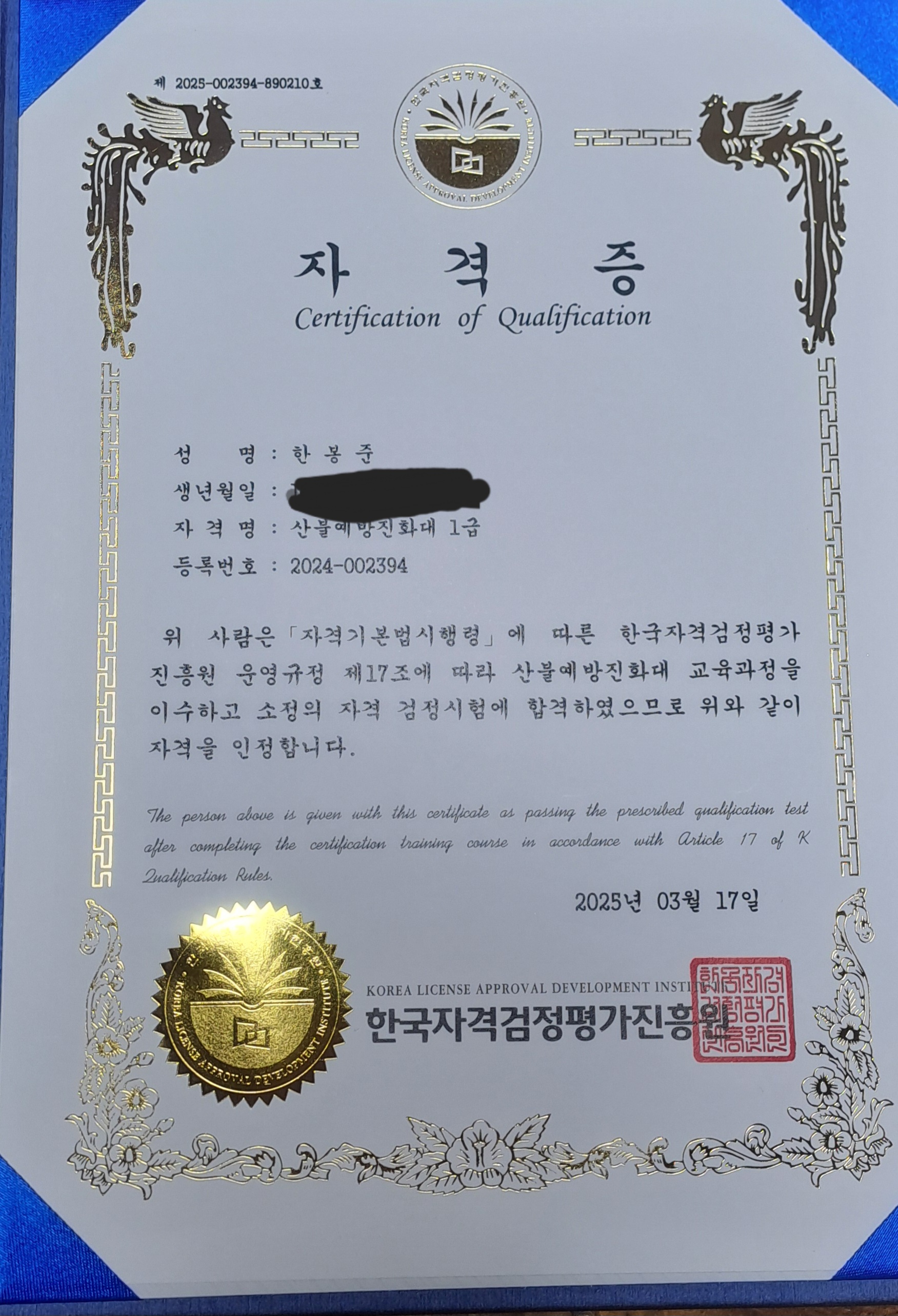 퇴직후 무슨일을 해볼까 생각중 우연히 보게된 산불예방 진화대1급 과정 합격후 구청등에서 가간제 모집 하는 산불예방 대원 지원에 많은 도움이 되겠습니다