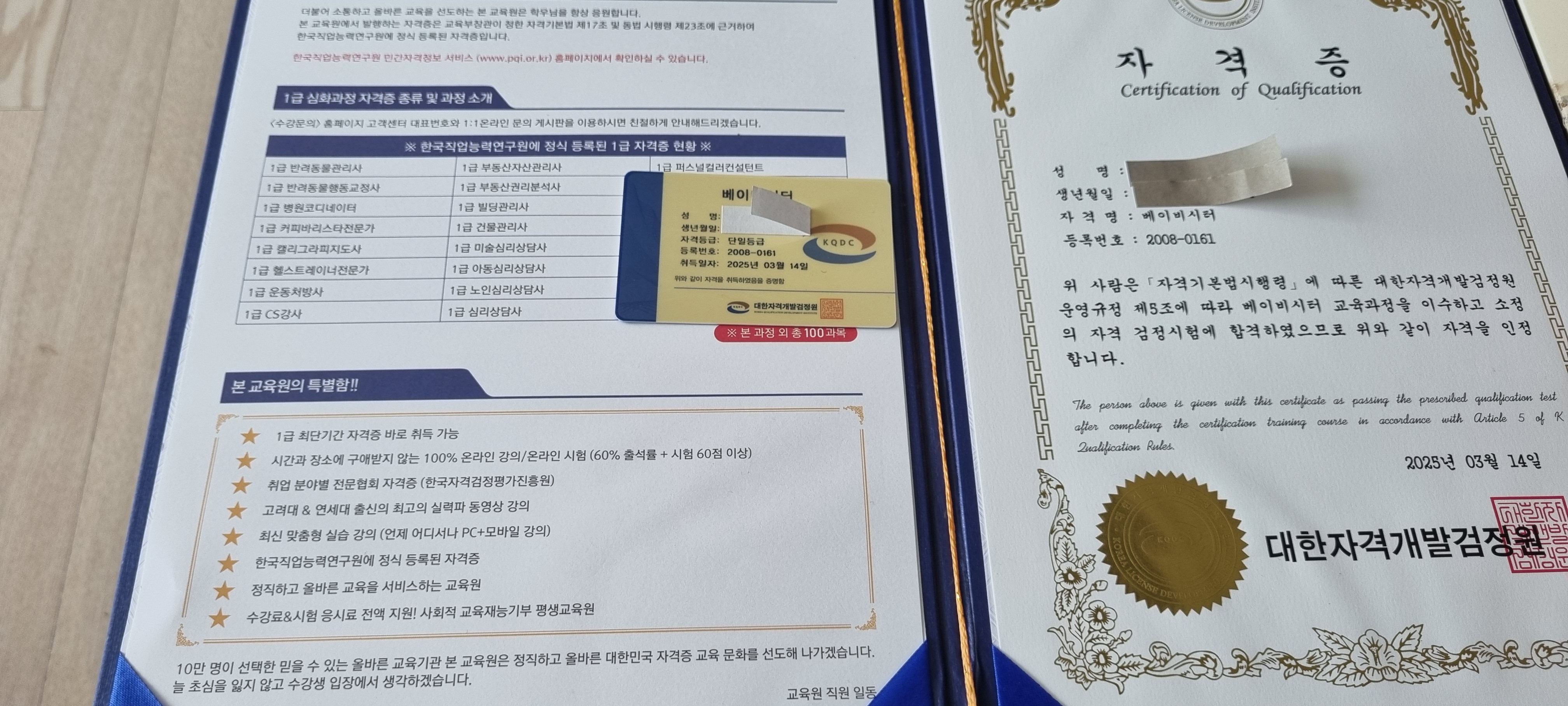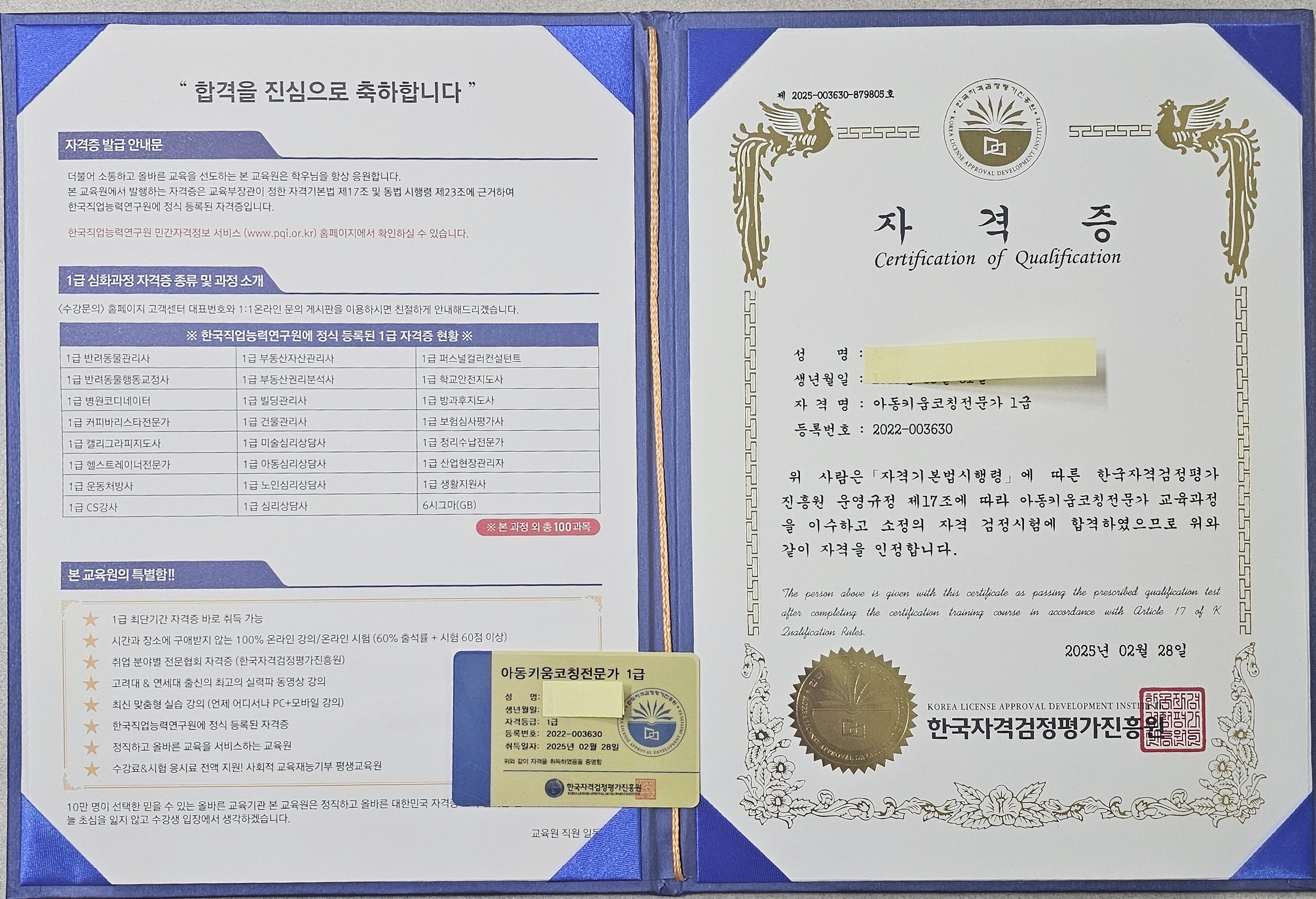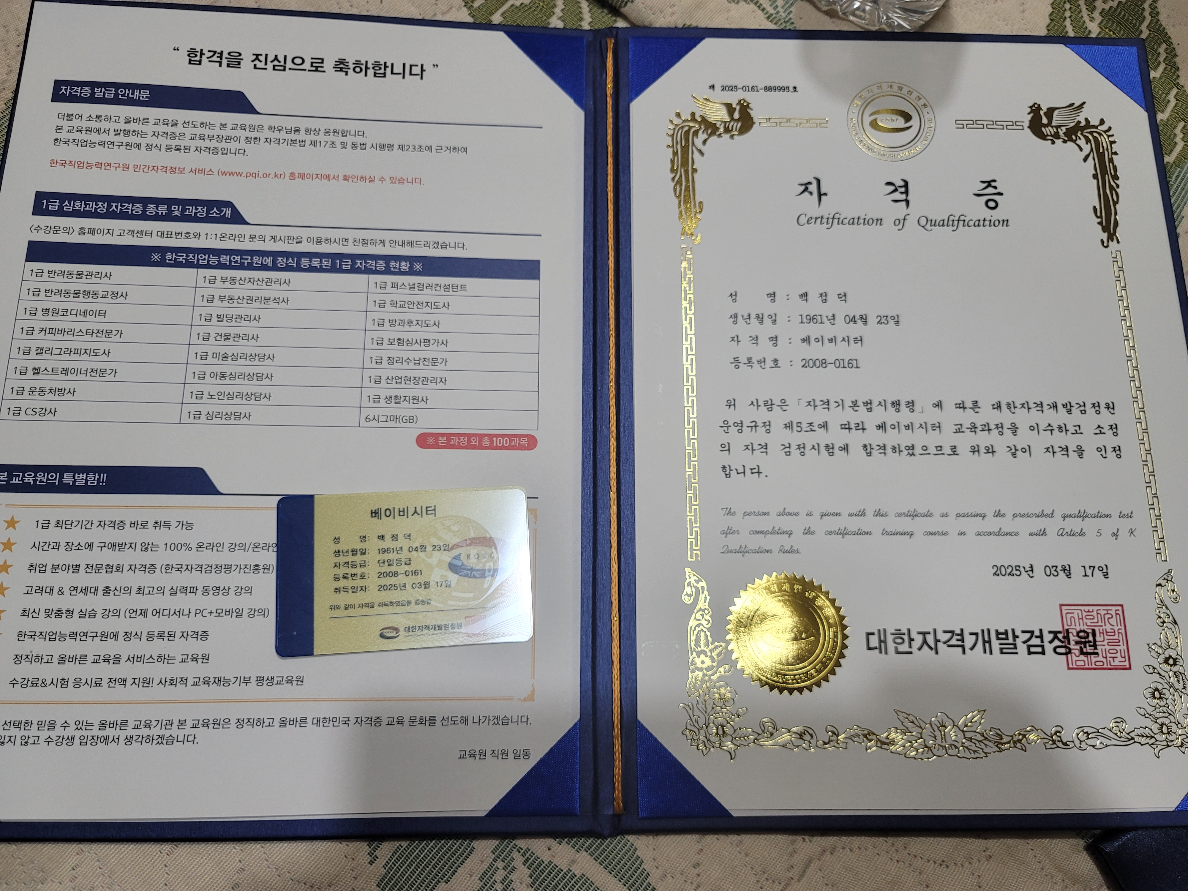 학원을 운영하는딸이 결혼10년만에 아이를낳고 그 육아를같이하면서 1년이 흘렀네요. 그경험을 살려 취업을할수있는방법이없을까 여기저기 검색을하다 자격증을 무료로딸수있는기회가있다는것을알고 신청해서,열심히듣고 바로합격! 좋은강의너무감사합니다