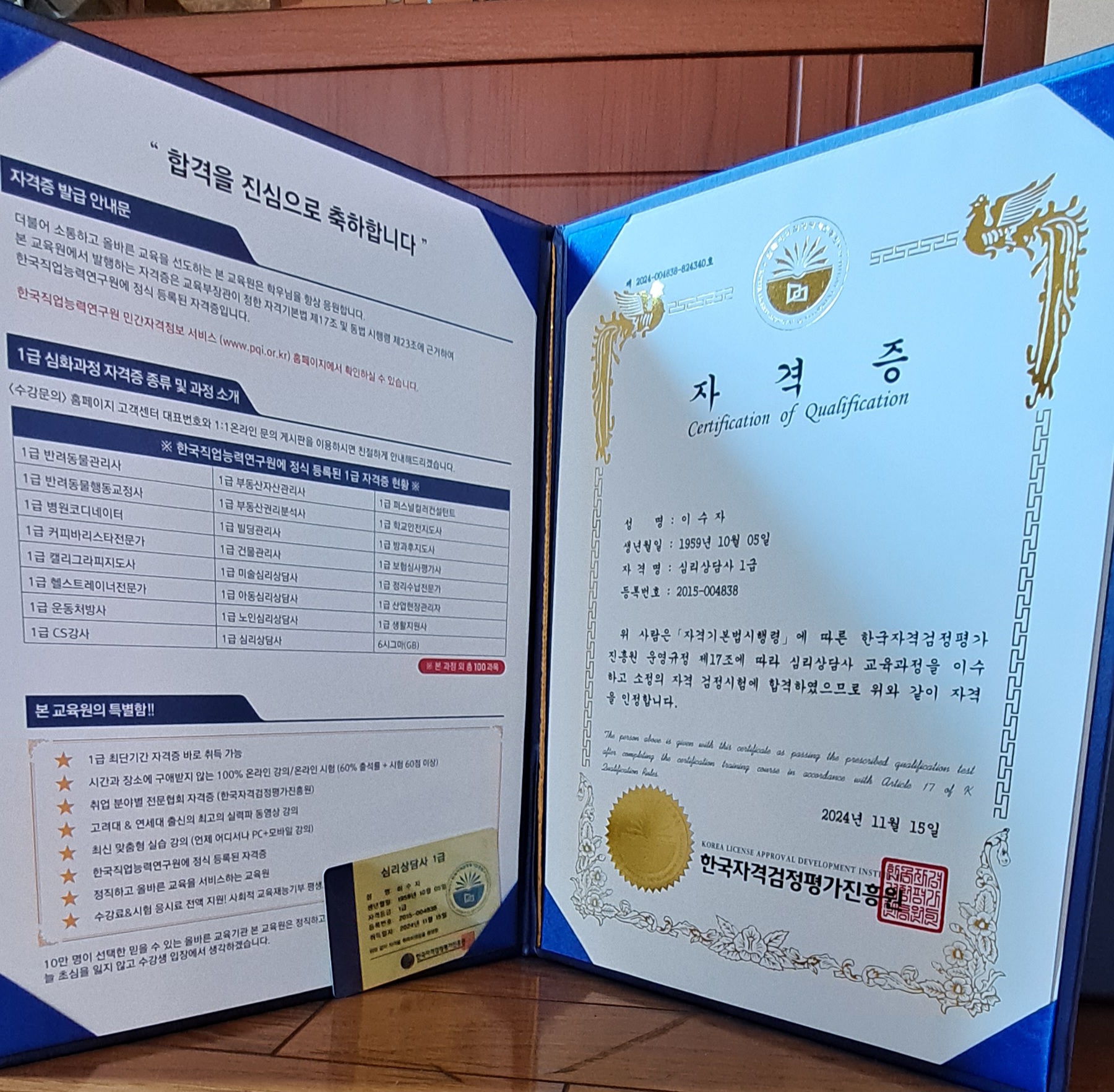 안녕하세요.~^^저는 자원봉시자 돌봄 일을 하고 있습니다. 우연히 국민교육복지센터를 알고 전문적인 자격증은 없으나 아이들과 지내면서 많은 도움이 될꺼 같아서 공부도 하면 더 나은 역량으로 아이들을 만날 수 있을꺼 같아서 응시 하여 합격증을 받을 수 있었습니다. 강의도 편하게 어디서나 들을수 있고 기출문제 예습도 할수있고,자격증이라는걸 딸 수 있어서 참 좋았습니다. 시간이 부족한 분들께 참 좋은것 같아요. 덕분에 좀 더 아이들과 밀접한 관계성을 가질수 있는거 같아서 만족 합니다. 감사합니다