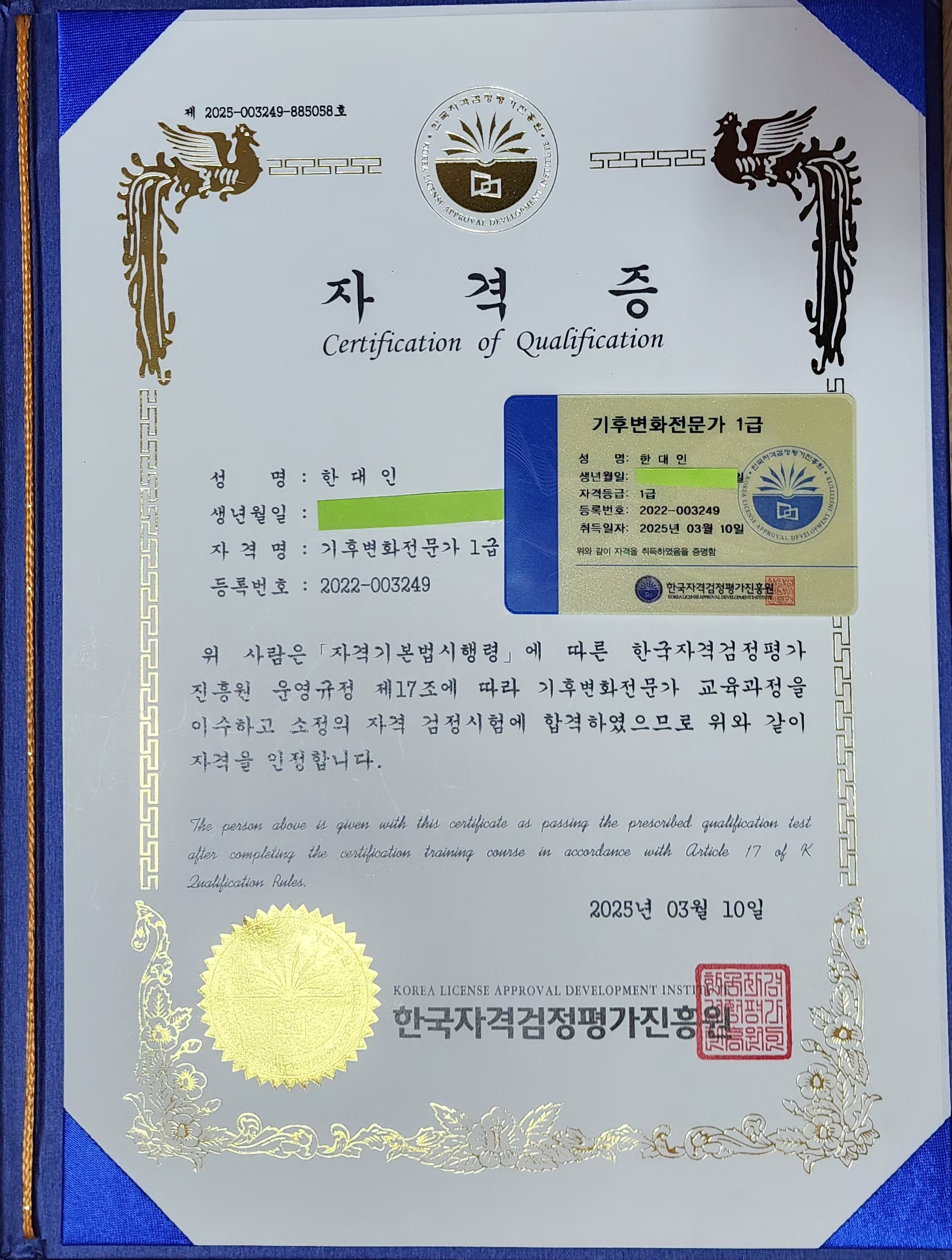 강의 첫날부터 책상에 앉아서 하루 종일 교수 님 의 말씀을 잘 듣다 보니 이렇게 합격이라는 커다란 상을 받게 되어 무한한 감사를 드립니다. 앞으로 기후변화에 적응하기 위해 최선을 다해 일하겠습니다.앞으로도 많은 지도를 부탁 드립니다.
