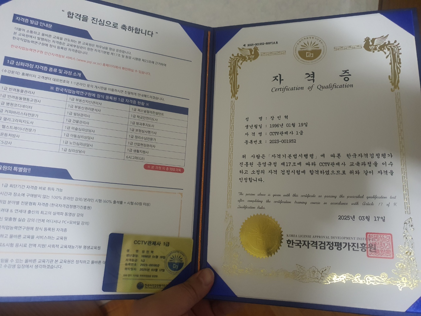 좋은 강의 들어 덕분에 바로 합격 할 수 있었습니다. 좋은 내용도 많았고, 바로 듣고 바로 시험을 볼 수 있다는 것도 좋은 장점 중에 하나죠. 덕분에 시험 보고 합격까지 해서 자격증이 오니 너무 기분이 좋습니다. 좋은 강의 감사합니다. ^^