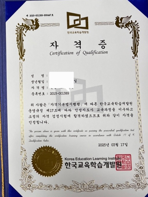인성교육 자격증이 필요했던 차에 이렇게 좋은 프로그램 소식을 듣고 바로 열공해서 땄어요 너무 뿌듯하고 기쁘네요